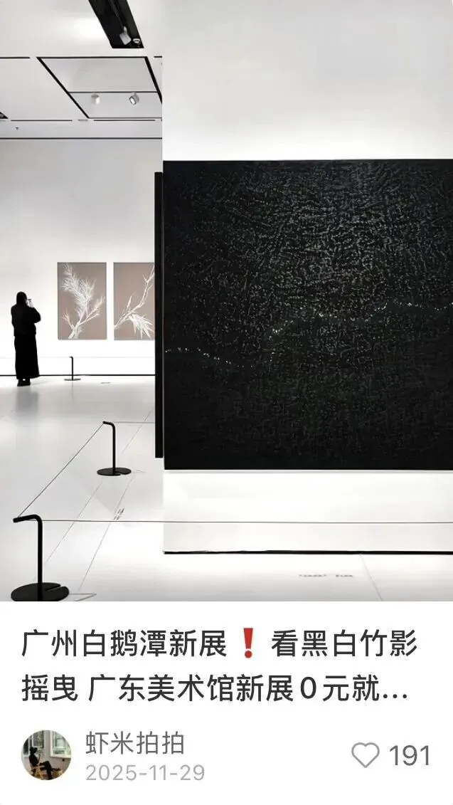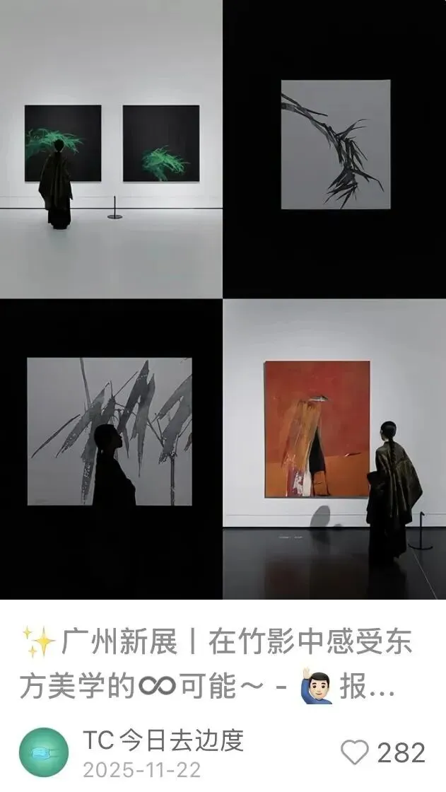 “从竹海走来,竹是刻在骨子里的灵感,笔下既有水墨的清雅留白,又融入了西方抽象构成的张力,70+作品,把风的迅疾与沉淀全展现,黑白、红、棕竹叶盘旋,仿佛能听见猎猎风声”。