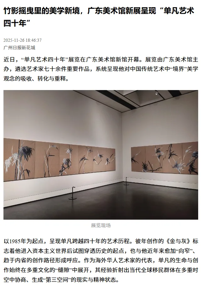 广东美术馆作为中国南方重要的当代艺术展示与研究平台,持续关注海外华人艺术家的创作实践。本次展览是广东美术馆当代艺术个案研究的重点项目,全面回顾了单凡自1984年赴德以来四十年的创作脉络,从具象到抽象,从东方笔墨到西方构成。单凡的创作,正是以这样的双向视野,在跨文化的激荡中实现了艺术语言的再造与精神维度的拓展。