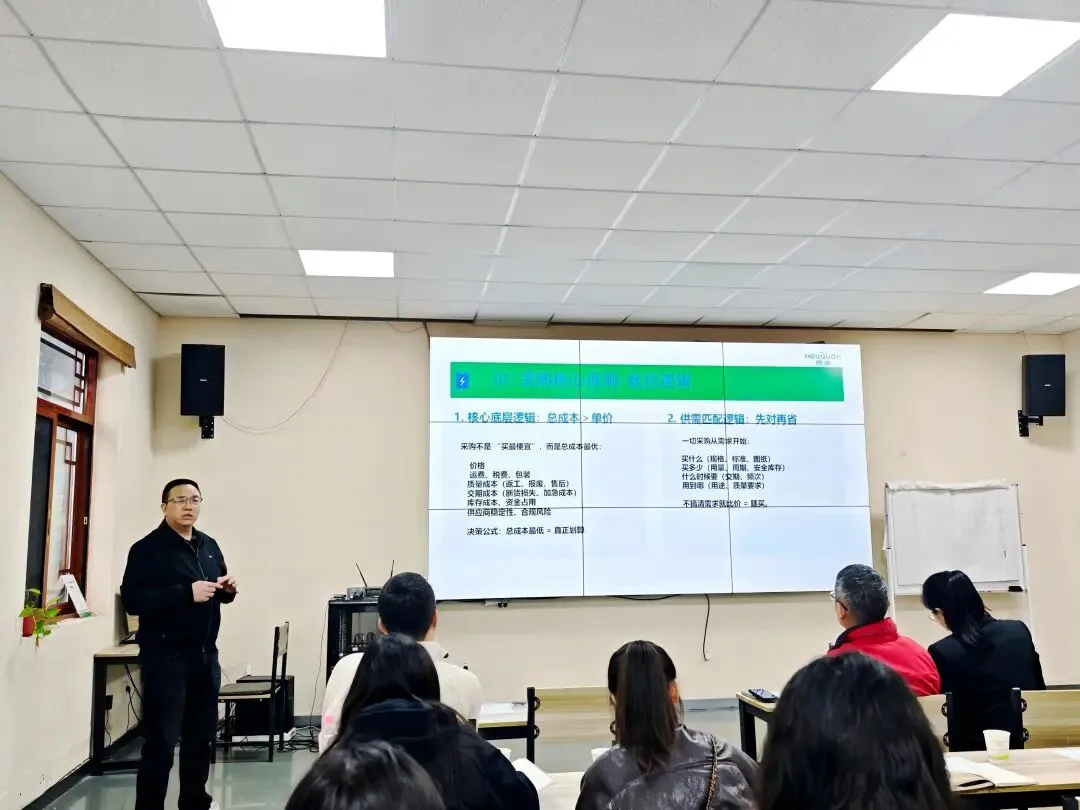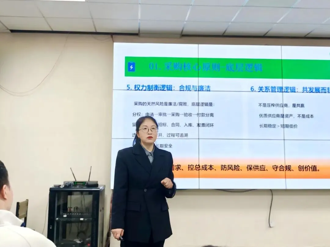 集团采购部经理程刚讲解了采购工作的核心原则:采购本质是管理不确定性,要坚持以质量为核心,实现成本、质量、供应的最佳平衡;优秀采购要成为“利润中心”,实现降本、提效、赋能;分权、留痕、透明是权力制衡的关键;优质供应商是资产而非成本。