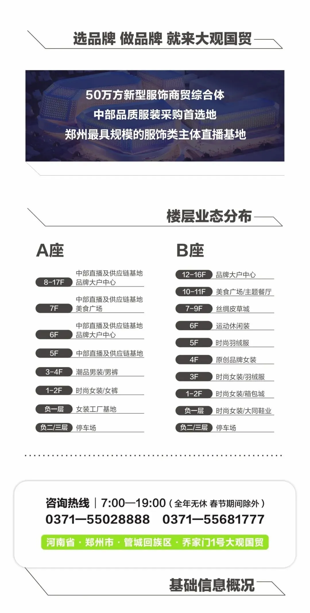 郑州大观国贸一期已运营30万方,是以服装经营为核心,集餐饮美食、休闲娱乐、直播电商于一体的新一代服饰商贸综合体。自2016年成立以来,项目迭代升级、精准布局,引入海量优质品牌与实力厂商,入驻商户1500余家,现已发展成为辐射中部六省的服装采批基地、服饰类主体的直播基地,为服装客户/时尚买手提供高品质、全品类的采购选择。