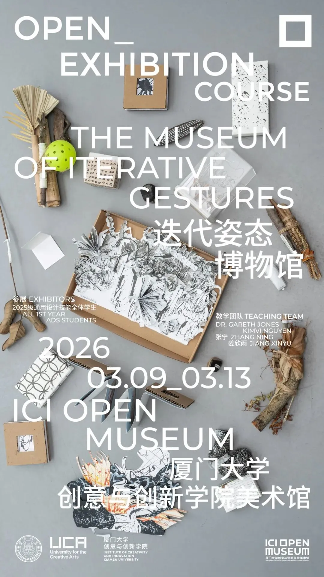 课程评估包含两项关键成果。第一项是一个实物作品集,被构想为一座“ADS博物馆”,在这里,学生将上述四个主题的创作过程材料与最终成果精心策划、标注说明,并陈列在一个纸板托盘里。第二项成果是一份20至25页的反思日志,其中记录了创作过程、独立研究以及对学习历程的扩展批判性反思。本次展览以所有248名学生提交的作品为ADS博物馆的主要内容:厦门大学创意与创新学院美术馆本身已然成为一座博物馆的博物馆。