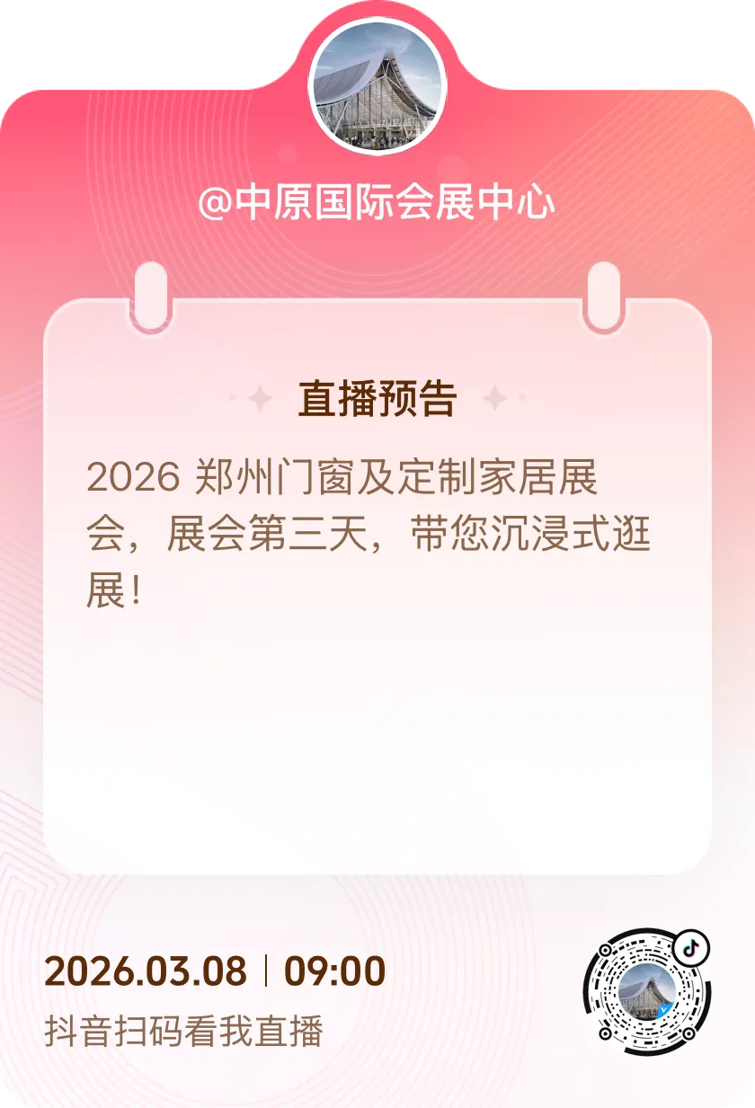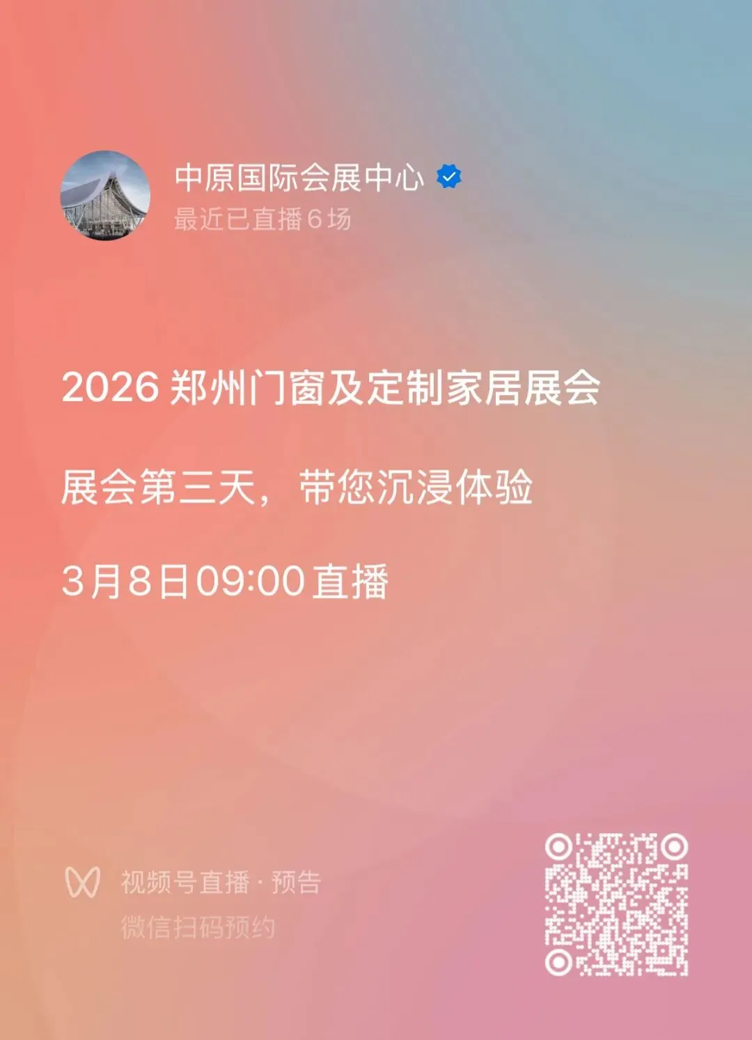 本次2026郑州门窗业暨整屋定制家居展开放时间已正式公示,线上直播时间同步展会节奏,建议大家合理规划线上云逛展、线下实地逛展的行程,错峰观展,轻松逛遍全场好物,不错过每一处精彩:3月6日-9日,每日9:00-11:00、14:00-16:00本次展会全程免费参观,无门票要求!线下逛展可直接前往河南中原国际会展中心,实地感受场馆实力、对接优质展商;云端逛展锁定中原国际会展中心微信视频号、抖音号,实时互动答疑,精彩不容错过!