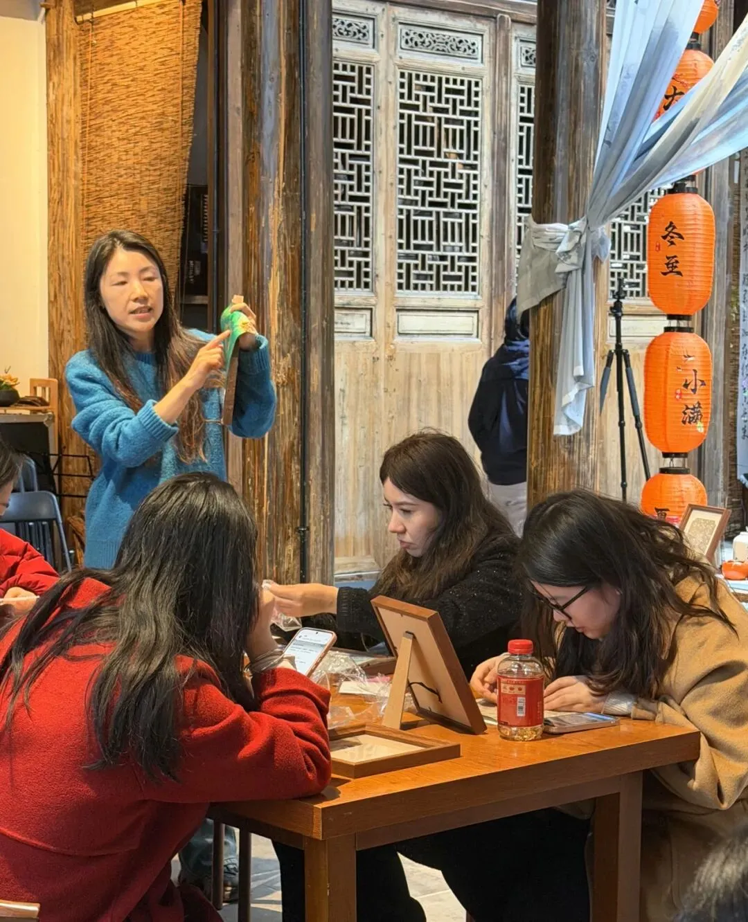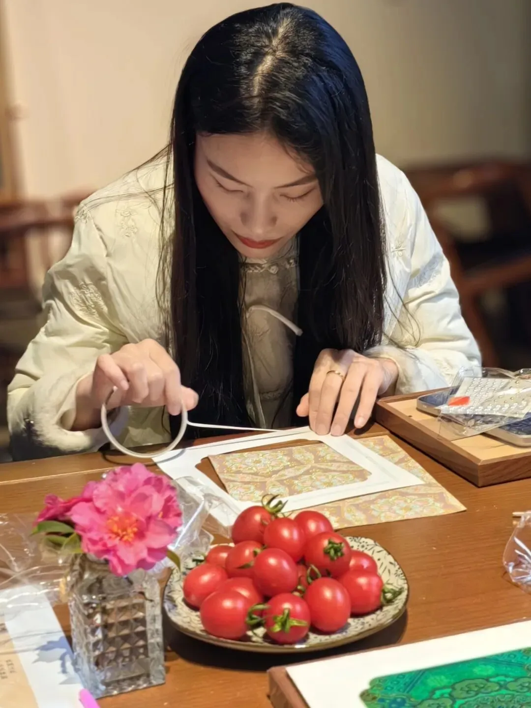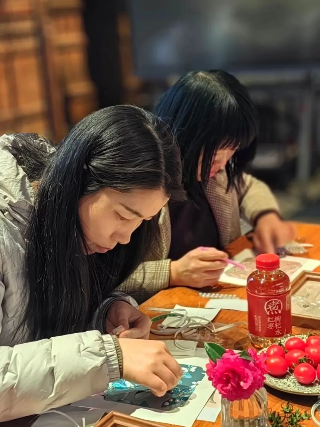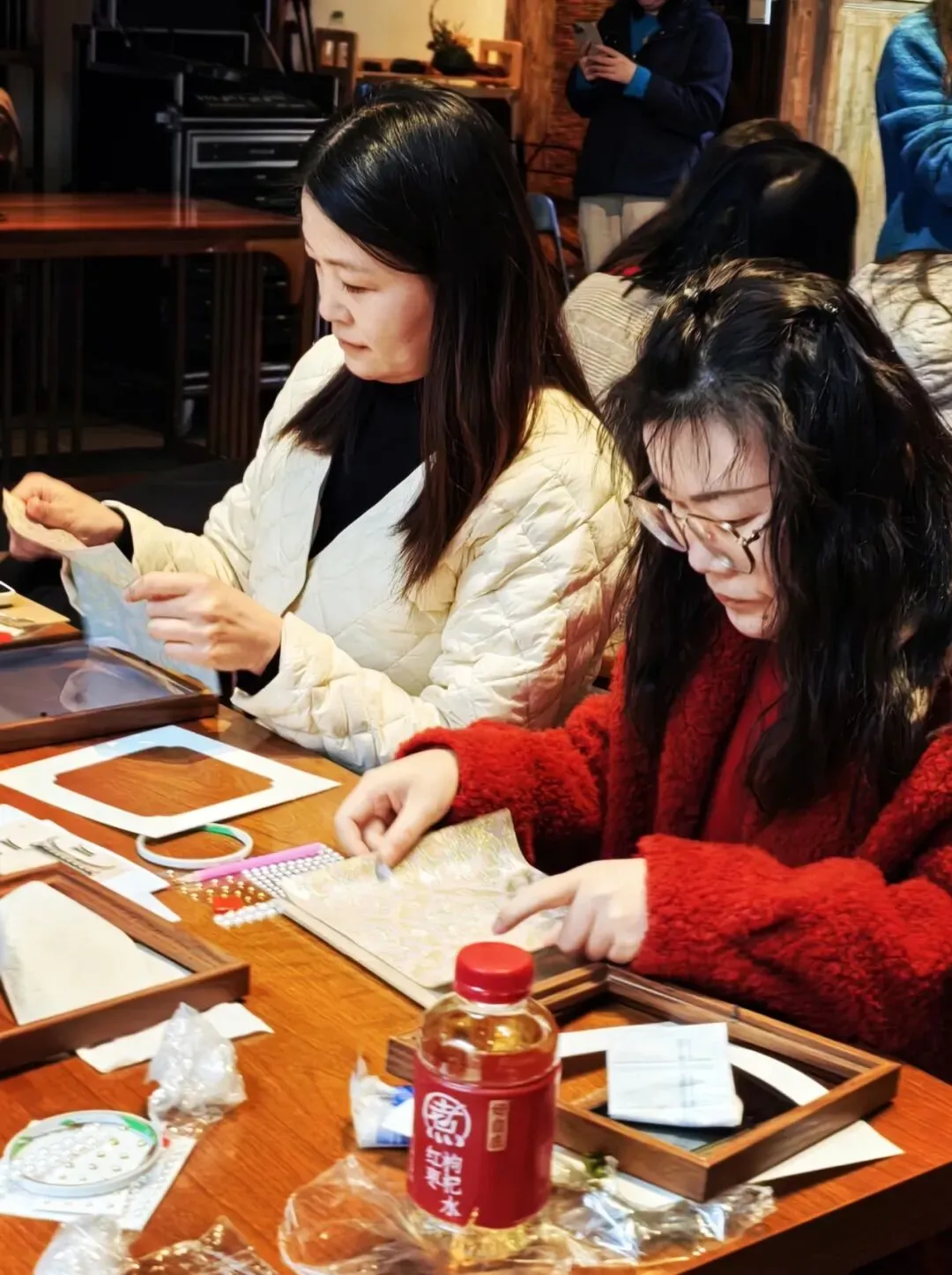 经过巧手创作,一幅幅独具匠心的仿宋锦珍珠画陆续完成,每一件作品都藏着中式美学的含蓄与贵气。女教职工们互相欣赏作品细节,交流创作心得与手工巧思,在轻松愉悦的氛围中增进了彼此感情,拉近了同事距离。