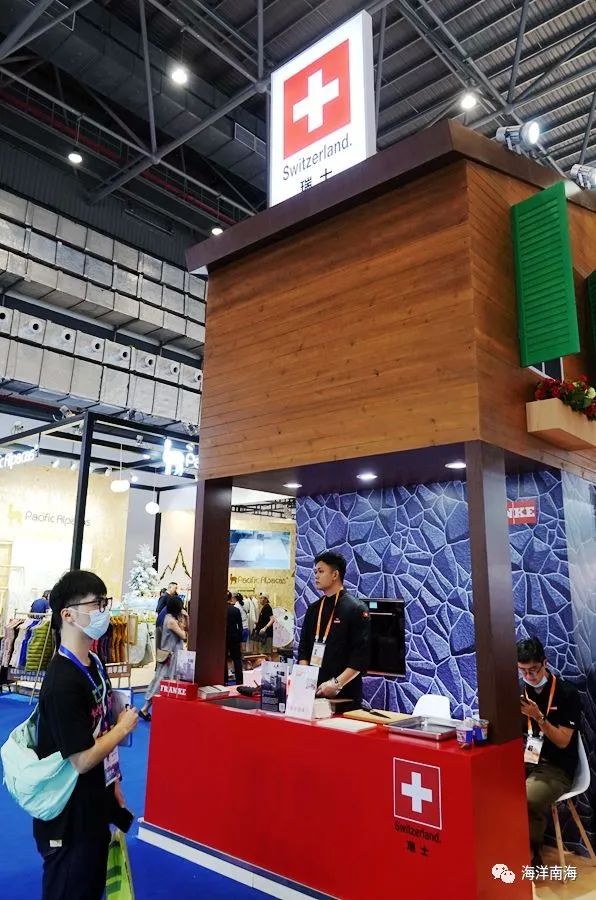 首届消博会主宾国瑞士继续沿用该国高山牧场的风格特点,在展位内铺上了绿色青草般的地毯,放置了奶牛等形象,还在展位搭起了两层高的木屋,让观展者仿佛穿越至高山牧场。