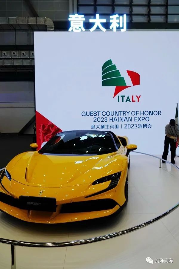 绿白红三色的“意式”展板前,一辆亮黄色的法拉利“蜘蛛SF90”顶级超跑备受关注。