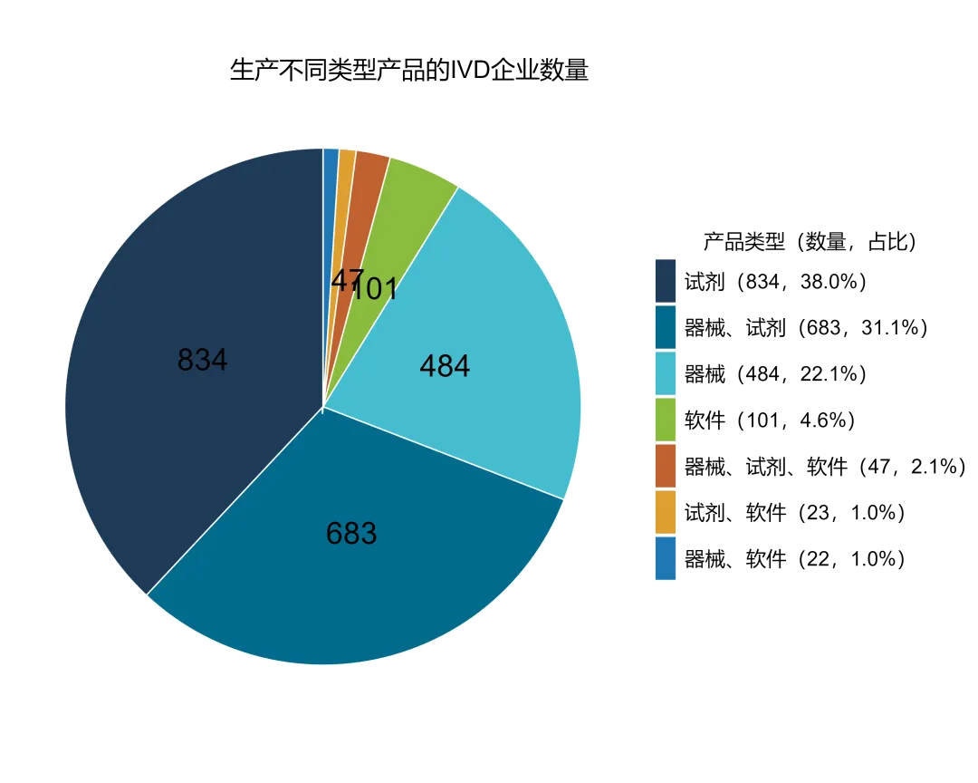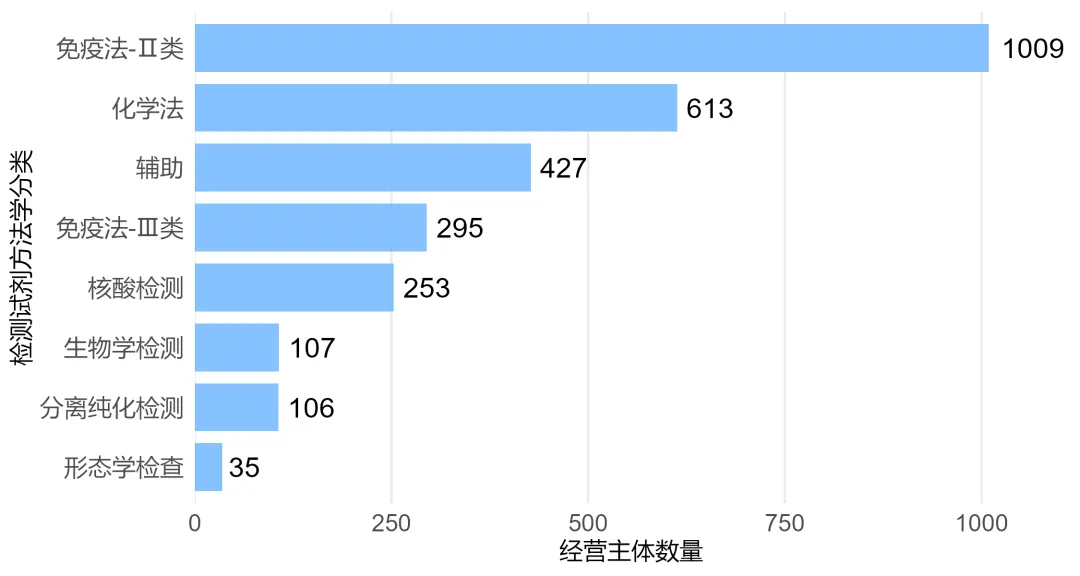 按产品类别划分,IVD试剂生产厂商1587家,IVD器械生产厂商1236家,IVD软件生产厂家193家(注:部分企业可同时生产多类产品,存在交叉统计)。其中,免疫法-Ⅱ类试剂生产企业达1009家,是细分赛道核心;化学法试剂、辅助试剂企业分别为613家、427家;免疫法-Ⅲ类试剂、核酸检测试剂企业分别有295家、253家,生物学检测、分离纯化检测试剂企业均突破100家,形态学检查试剂企业35家,细分布局各具特色。
