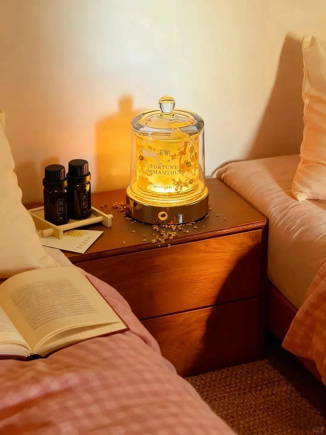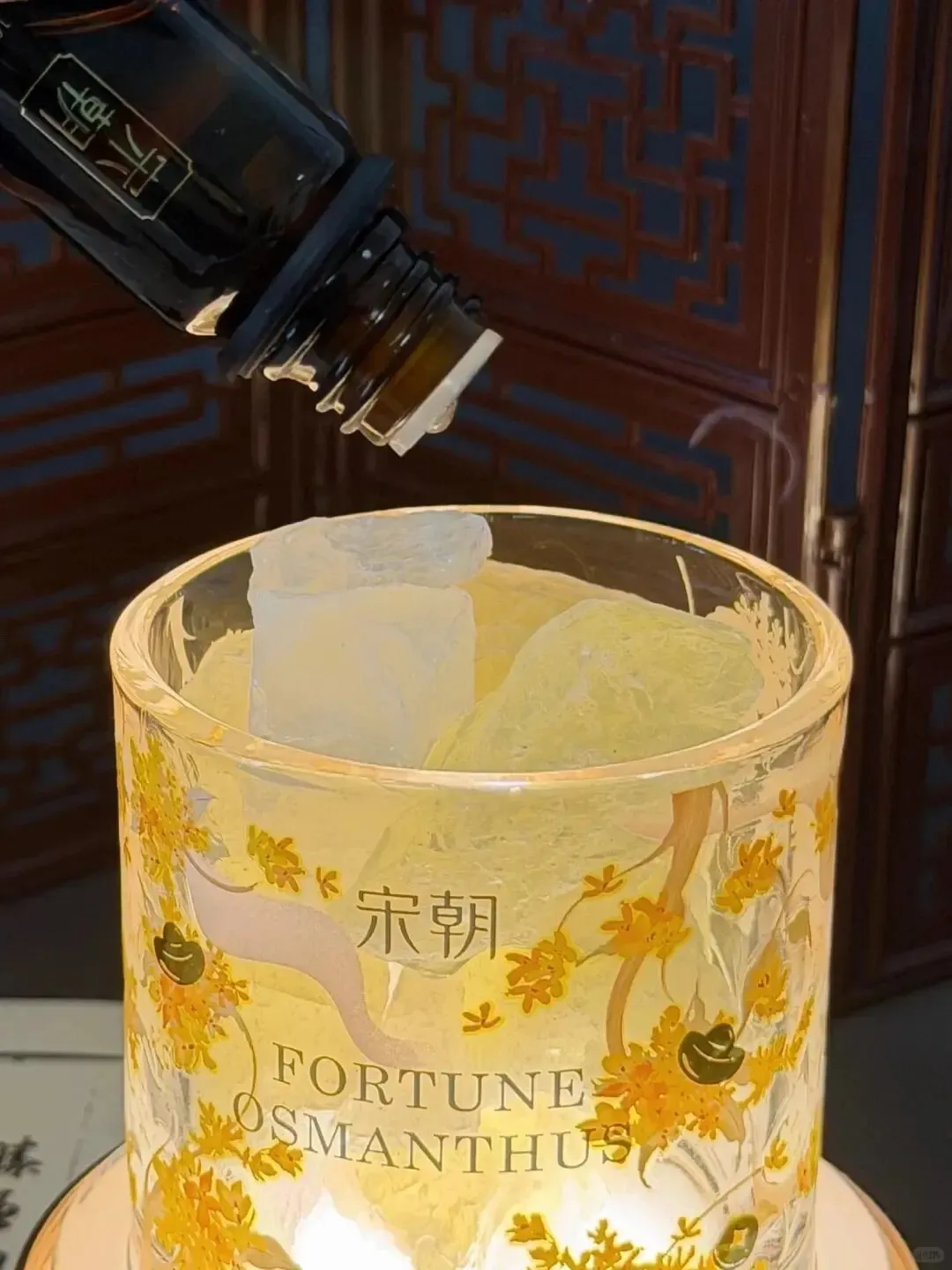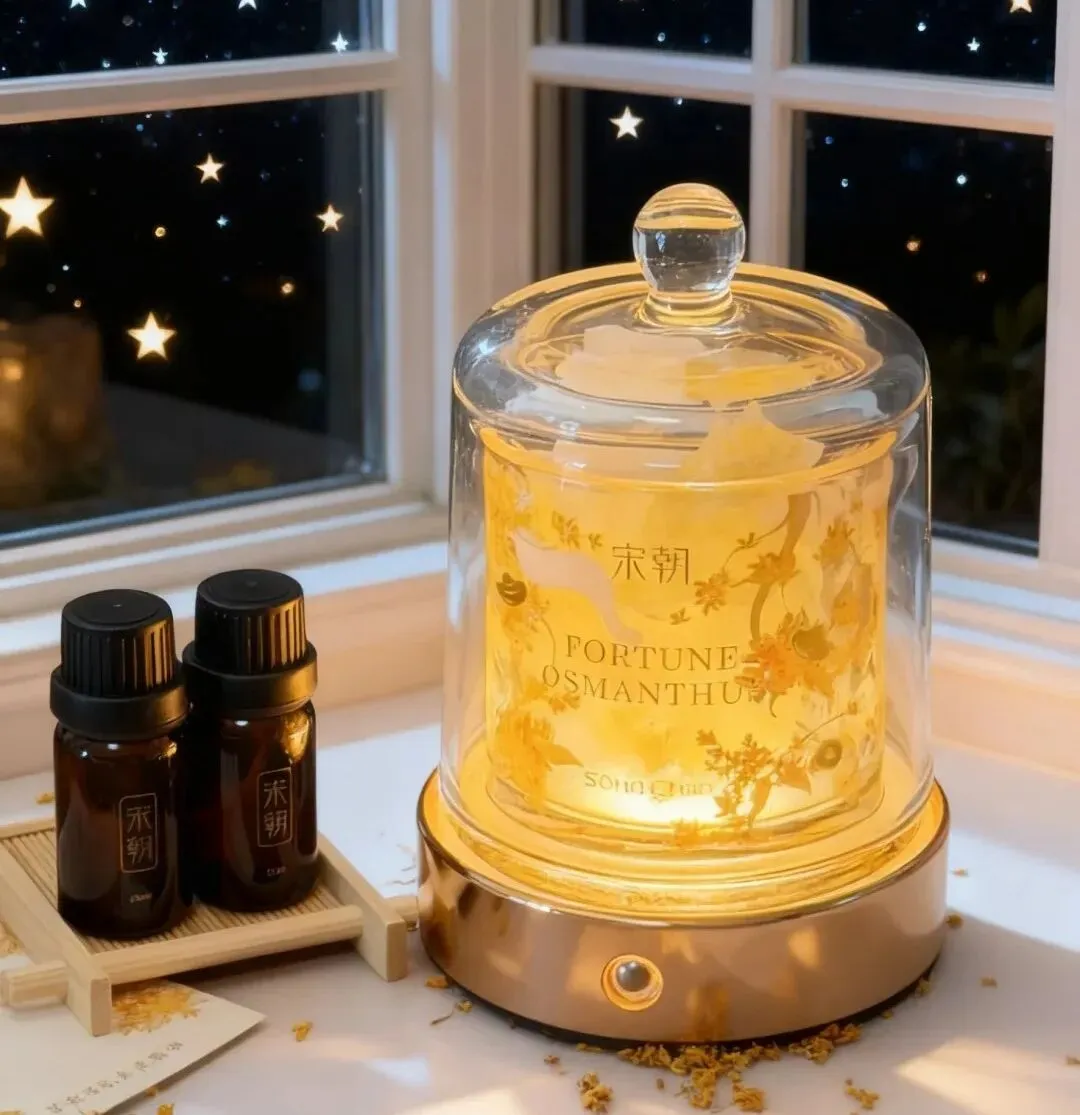 扩香石香薰搭配发光灯座,将扩香石置于灯上滴入精油,三色灯光自由切换,氛围一秒到位,香味更是惊艳。瓶身采用烫金元宝与铜钱纹设计,精致又富贵,赋予礼物更深刻的寓意。