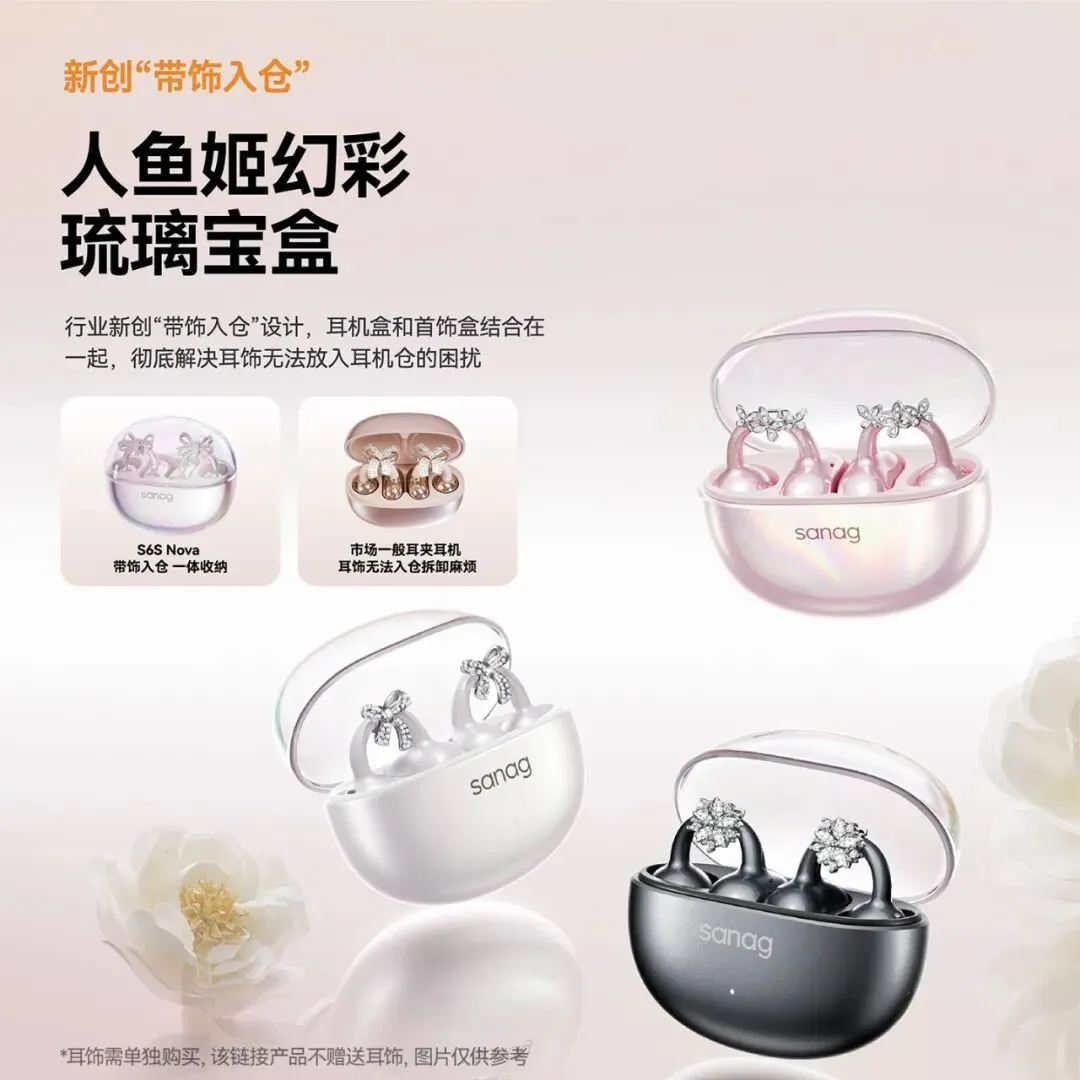 通勤路上,耳机才是真正的灵魂伴侣!尤其推荐这款【塞那S6S Nova耳饰耳机】,耳夹式设计全天佩戴无负担,搭配可DIY拆卸的闪亮钻饰,轻松拍出氛围感大片。更贴心的是,充电时可整体放入充电仓,再也不用担心小钻扣丢失。它既是耳机又是配饰,完美拿捏了爱美又怕麻烦的我们。