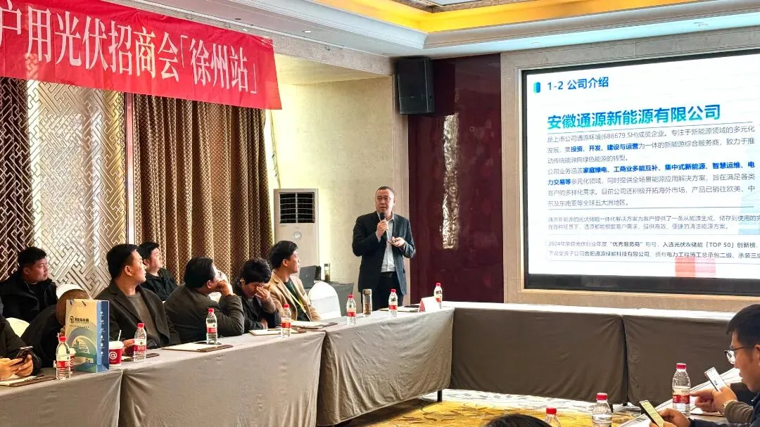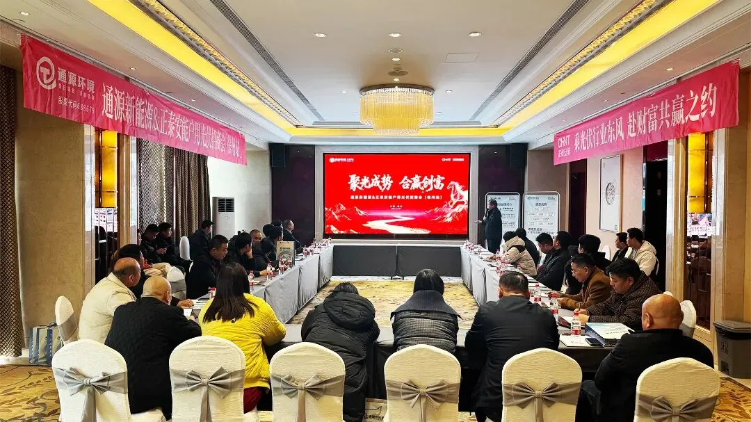 本次招商会以“聚光成势·合赢创富”为主题,聚焦徐州户用光伏市场潜力,搭建高效对接平台。会上,正泰安能代表详细介绍了其作为户用光伏行业领军企业的品牌实力、全链条产品体系与标准化服务保障。通源新能源则立足上市公司优势,阐述了公司在区域市场运营、项目落地及客户服务方面的核心能力,展现了深耕徐州、服务本地的决心。