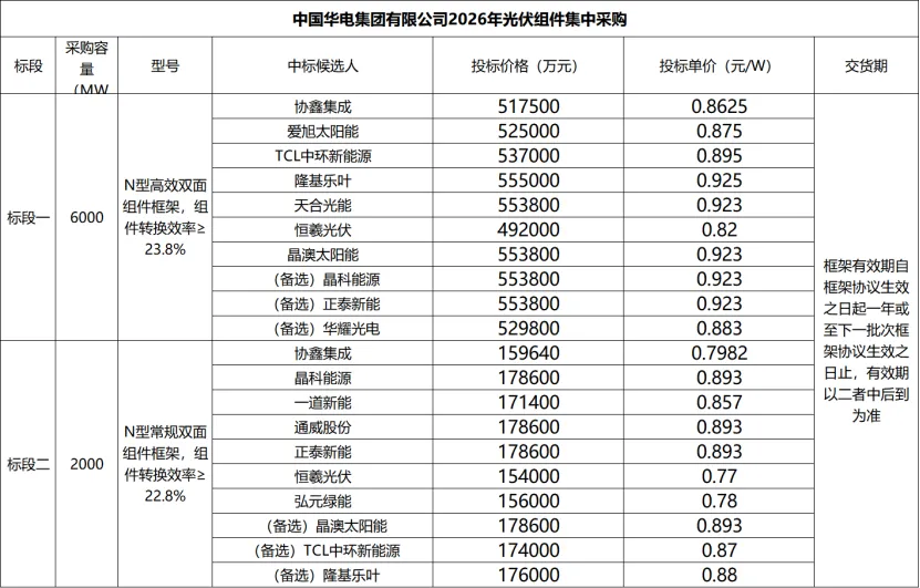 3月3日,中国华电集团有限公司2026年光伏组件集中采购中标公示,本次集采包括N型高效组件框架、N型常规组件框架两个标段,采购范围为框架有效期内华电集团部分新能源项目所需的N型高效及常规单晶硅双面双玻组件。