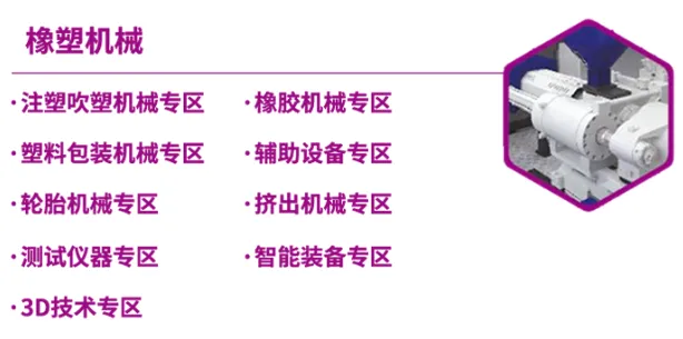 橡塑机械:涵盖注塑吹塑机械、橡胶机械、塑料包装机械、辅助设备、轮胎机械、挤出机械、测试仪器、智能装备及 3D 技术等专区,全面展示行业智能生产装备。