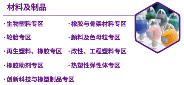 材料及制品:包含生物塑料、橡胶与骨架材料、轮胎、颜料及色母粒、再生塑料与橡胶、改性工程塑料、橡胶助剂、热塑性弹性体等品类,同时特设创新科技与橡塑制品专区,呈现前沿技术成果。