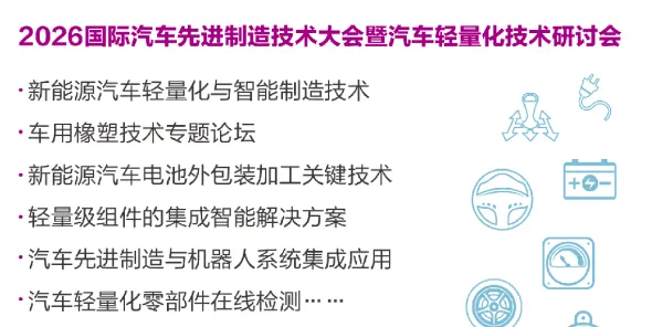 同期将举办2026国际汽车先进制造技术大会暨汽车轻量化技术研讨会,聚焦新能源汽车轻量化、车用橡塑技术、电池包装及在线检测等核心议题,助力汽车与橡塑产业跨界融合。