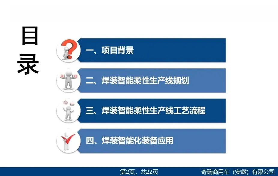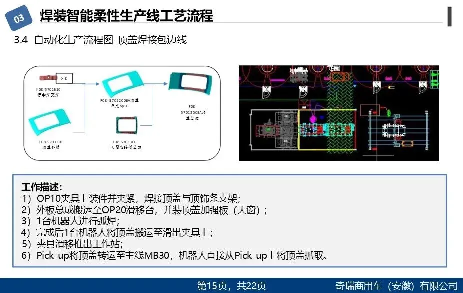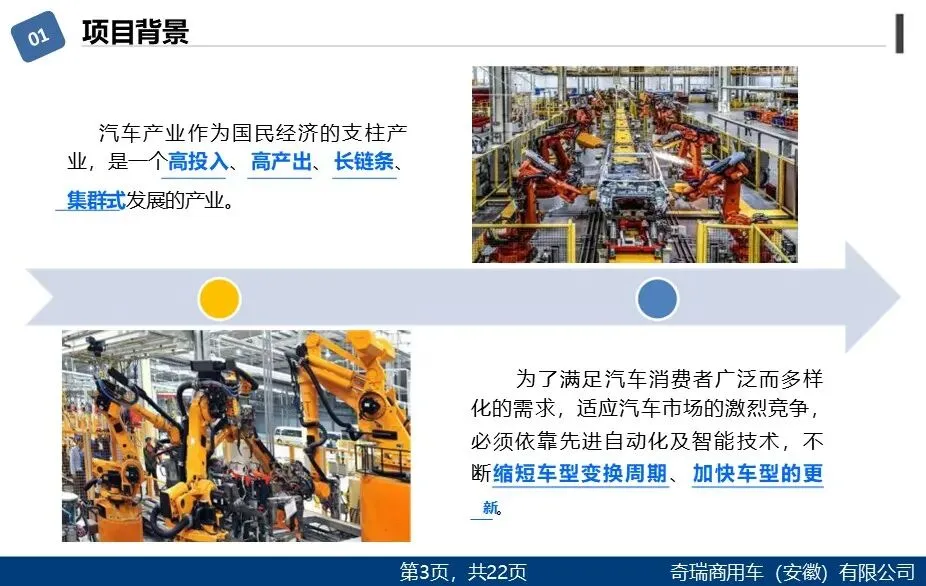 该方案围绕奇瑞商用车焊装车间智能化升级展开,以年产18万辆、节拍120秒为目标,规划了高柔性自动化生产线。通过引入机器人、RFID、视觉引导等智能装备,实现主焊、侧围、发舱等关键工序的自动化与多车型快速切换。方案强调系统集成与数据监控,旨在提升生产效率、保障焊接精度,推动制造向智能化、柔性化转型。