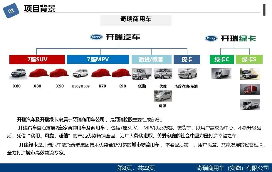 企业定位:开瑞汽车(含开瑞绿卡)隶属奇瑞商用车,覆盖SUV、MPV、微客、微货及城市物流车,需要柔性化产线以快速响应多车型共线生产需求。