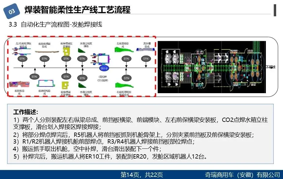 工序涵盖机器人装配+涂胶+定位焊、机器人补焊、人工弧焊、在线检验等。