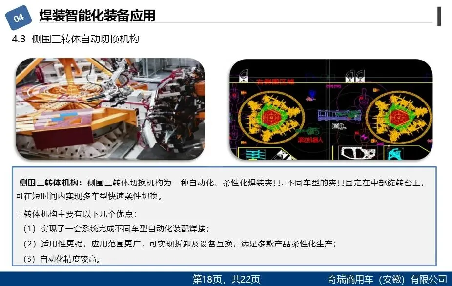 精度保证机构:侧围三转体自动切换机构,可在短时间内实现多车型夹具快速切换,具备高柔性、高精度、易维护特点。