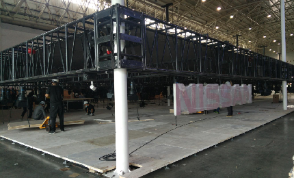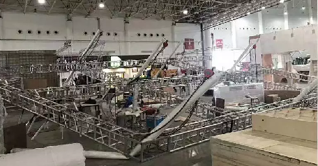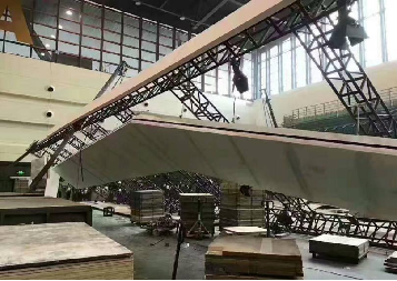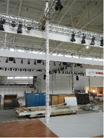2.展台天棚的举升。无论是悬挂天棚或立柱天棚,在地台上组装完成后必须举升7m至8m的高度,天棚的垮塌往往发生在这个环节,所以尤为重要。无论使用手动或电动葫芦举升,起吊时要水平同步平稳举升,防止突然加速或突然减速,举升到位后检查是否水平再固定。为保证水平同步,可采用激光或立柱标尺的方法进行。