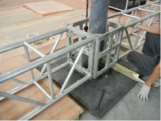 展台天棚搭建一般在现场完成,分两个部分:天棚Truss架的组装成形,整体天棚的举升。1.展台天棚组装。 Truss架都是现场分段组装的,所以连接时一定要是锁紧螺母严防松脱,对于立柱天棚立柱和基座更要锁紧螺母并调平基座使之稳定,并保证与地台垂直。