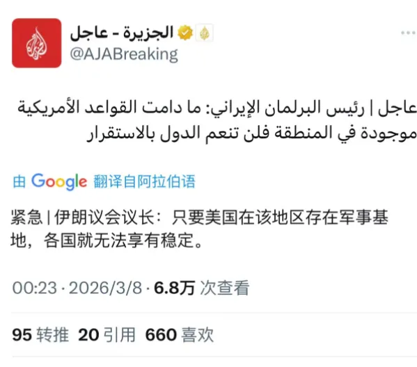 -----------------------------------------------------在昨天伊朗总统宣布,说根据临时委员会三人组讨论,决定制止攻击海合会。1.看过我之前的都知道,海合会其实不站美国,也不想卷入战争,他们的美军基地没有被用来攻击伊朗。2.海合会的美军基地,在这几天超过2300发导弹无人机的攻击后,基本都烂掉了。3.在伊朗议会长说完这个,伊朗继续还在攻击海合会的民生设施。-----------------------------------------------1.我之前说,海合会在中东玩伊朗和以色列的平衡,但是伊朗的实力如今已经没办法用来作为海合会掣肘以色列的一方了。2.怕打不过?海合会拥有比以色列规模更大的空军,伊朗已经是一只拔毛鸡了,导弹都没有多少。3.怕伊朗攻击他们?伊朗这几天80%的导弹无人机都用来攻击海合会了,本来就没有这个顾虑答案只有一个:他们不想把美国以色列攻击ysl国家,变成ysl国家的内斗,逊尼派什叶派的内斗,好让以色列脱身,让美国在中东制造ysl的混乱,破坏全球能源供应,打击我们这样的依赖中东能源的工业国,甚至不惜利愿意欧洲重新购买俄罗斯的能源。我们当然也可以去买俄罗斯的油,但是我们一带一路的进度,我们在中东的规划,会彻底失败,从而逼着沙特重新投靠美国,给以色列解套。------------------------------------------------------伊朗是知道海合会并不是美国的附庸,因为沙特伊朗和解,就明摆着了。伊朗80%的导弹无人机都用来攻击海合会了,而不是正在打击他们的美国以色列,就非常离谱,因为他们知道沙特和我们美国的关系,沙特并不会帮美国攻击他们。1.攻击美国以色列才是“抵抗美国以色列的决心”,攻击海合会则是绑架全世界,导弹无人机的数量说明了伊朗抵抗美国以色列的决心只有20%。2.攻击海合会是在配合美以,引发ysl内斗,他们80%的目标都在引发ysl内斗。伊朗完全出问题了,很严重的问题,他们现在内部主导的人,很有可能已经是“内鬼”了,甚至从哈梅内伊死后一开始就是。有人可能会说,海合会公开宣布要求美国撤回美军基地行不行?俄罗斯梅德韦杰夫今天也说美军基地已经是攻击海合会的工具了。但是只要想攻击海合会,内鬼自然能找到理由,这个议会长直接把今天美国以色列炸他们的海水淡化厂,重点放在了栽赃海合会,除非海合会把自己的空军也全炸了,可能吗?美国以色列决定炸死哈梅内伊,不但不是想引发伊朗混乱,反而有可能是,已经确定自己的内鬼,能在哈梅内伊死后,掌握最大的话语权。怎么确定的?哈梅内伊之前预感自己可能危险,不是说每个高级领导人都选了4个接班人吗?我觉得恰好是这个决定,让美以确定自己的内鬼能够掌控伊朗这个国家,才决定送走哈梅内伊,让自己的内鬼顺利上位。我不是说这个议会长一定是内鬼,他也许是个被利用的蠢蛋,也许这个内鬼是“一个群体”。------------------------------------------------------也就是说,目前巴基斯坦,阿塞拜疆,库尔德人行动,背后可能不是美以,是海合会-土耳其,所以才有3月4日,阿联酋总统给库尔德打电话,他们早就意识到了问题。这时候美国高喊说他们准备抢伊朗的石油,就会被内鬼利用,鼓动革命卫队跟这几个势力拼,因为他们觉得自己是在跟美以拼。-----------------------------------------------------------------我目前也终于能确定,我们在重点扶持沙特的无人军事系统,海合会的王爷们,一直就是钱多电多,没人,我之前说,王爷们吃亏就在没人,无人作战的出现,会改变王爷们的处境。-------------------------------------------------------------如果库尔德人这次能聪明明智一点,坚定的干进伊朗,也许一个库尔德国,将在伊朗诞生,霍尔木兹海峡,将被海合会彻底控制。此战之后,解决了伊朗。(我是说如果美国不刹车,放任中东这么搞下去。海合会带领的阿拉伯人,很大概率会彻底撕掉跟美国的“虚与委蛇”,独立走上世界舞台。-------------------------------------------------------------那我有个问题,美国以色列这一次的算计确实厉害,但到底是美国以色列算计到了所有人?