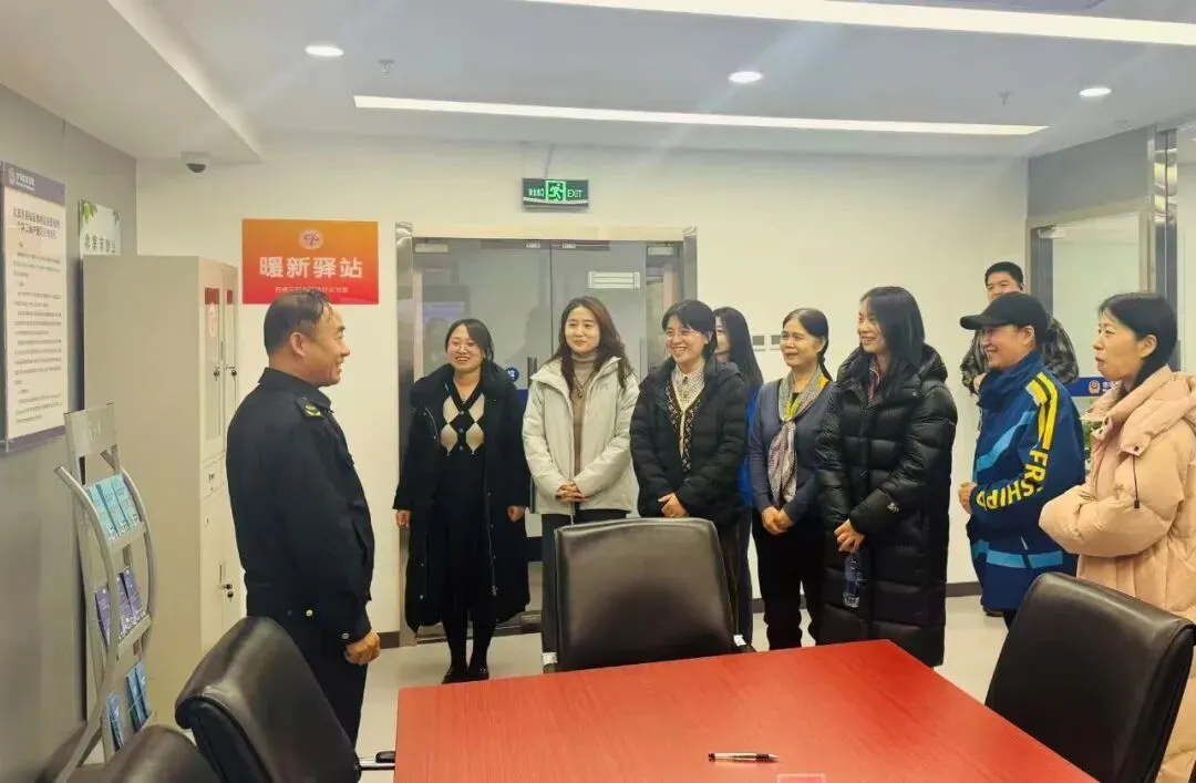 在服务大厅,大家共同参观了外卖配送员“暖新驿站”。站内饮水机、微波炉、充电设备、休息座椅等设施一应俱全,这里不仅是骑手们“冷可取暖、热可纳凉、渴可喝水、累可歇脚”的温馨港湾,更是他们“充电赋能”的精神家园。