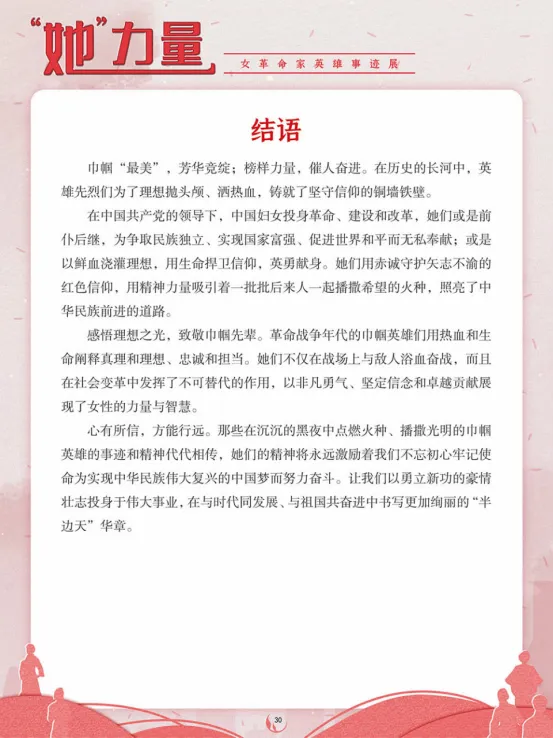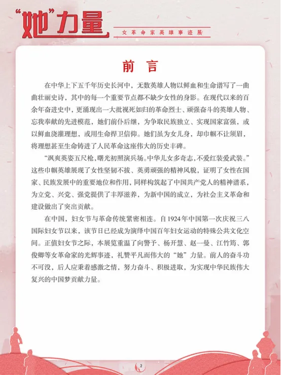感悟理想之光,致敬巾帼先辈。革命战争年代的巾帼英雄们用热血和生命阐释真理和理想、忠诚和担当。她们不仅在战场上与敌人浴血奋战,而且在社会变革中发挥了不可替代的作用,以非凡勇气、坚定信念和卓越贡献展现了女性的力量与智慧。在中华上下五千年历史长河中,无数英雄人物以鲜血和生命谱写了一曲曲壮丽史诗,其中的每一个重要节点都不缺少女性的身影。