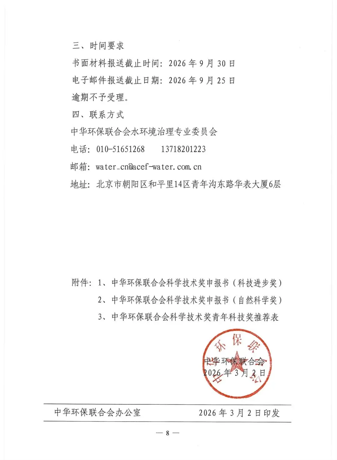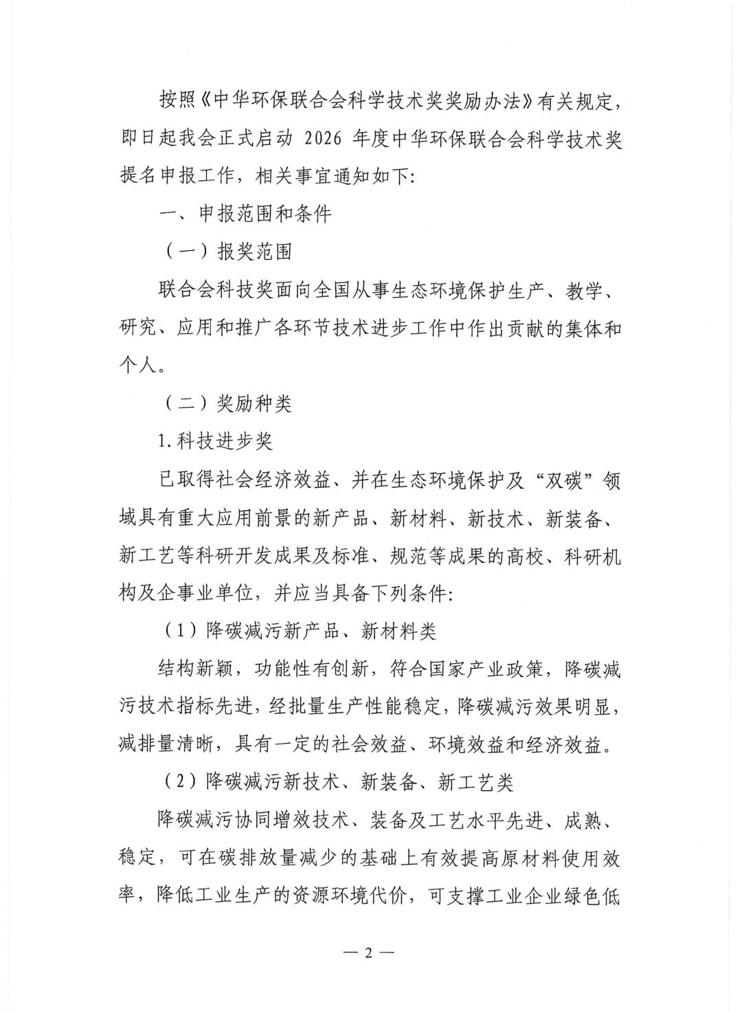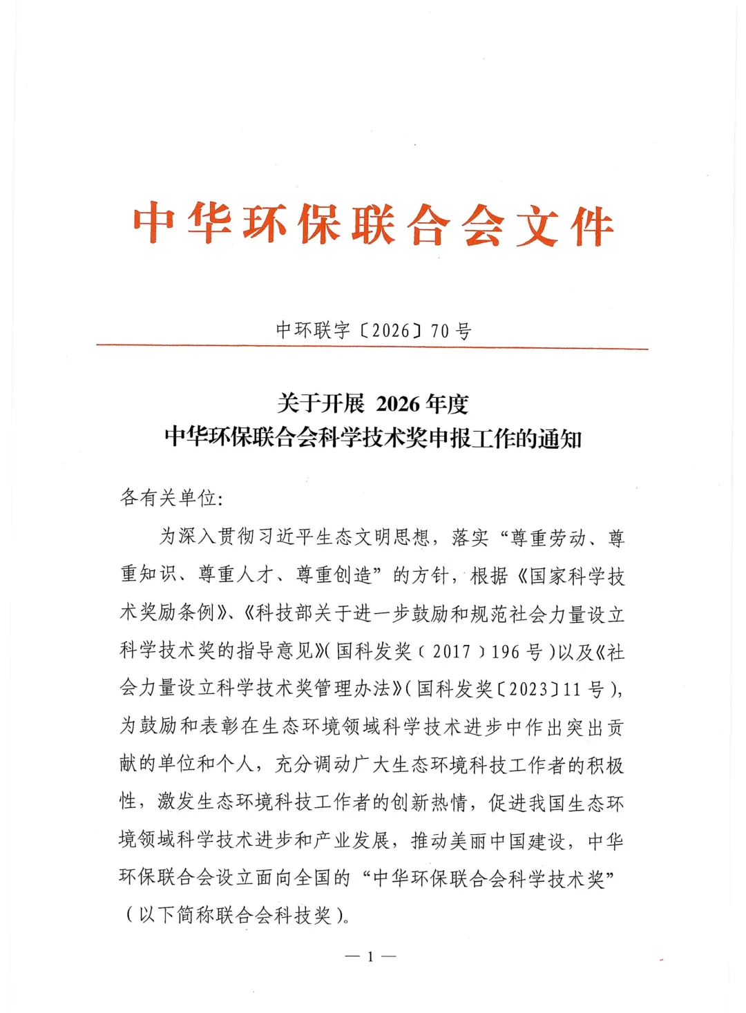 关于开展2026年度中华环保联合会科学技术奖申报工作的通知