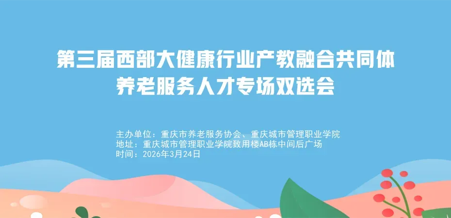 养老服务人才队伍建设是推动养老事业高质量发展的关键。为落实党中央、国务院关于高校就业工作的决策部署,引导人才到养老服务领域充分就业,重庆市养老服务协会、重庆城市管理职业学院定于2026年3月24日(星期二)举办第三届西部大健康行业产教融合共同体养老服务人才专场双选会,诚邀各用人单位报名招聘、各院校学生现场择业。