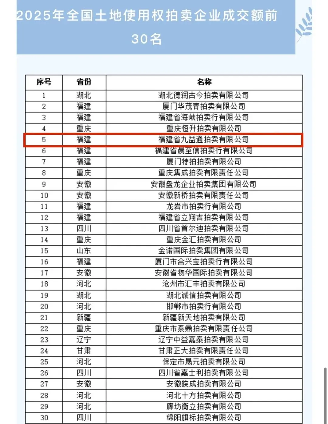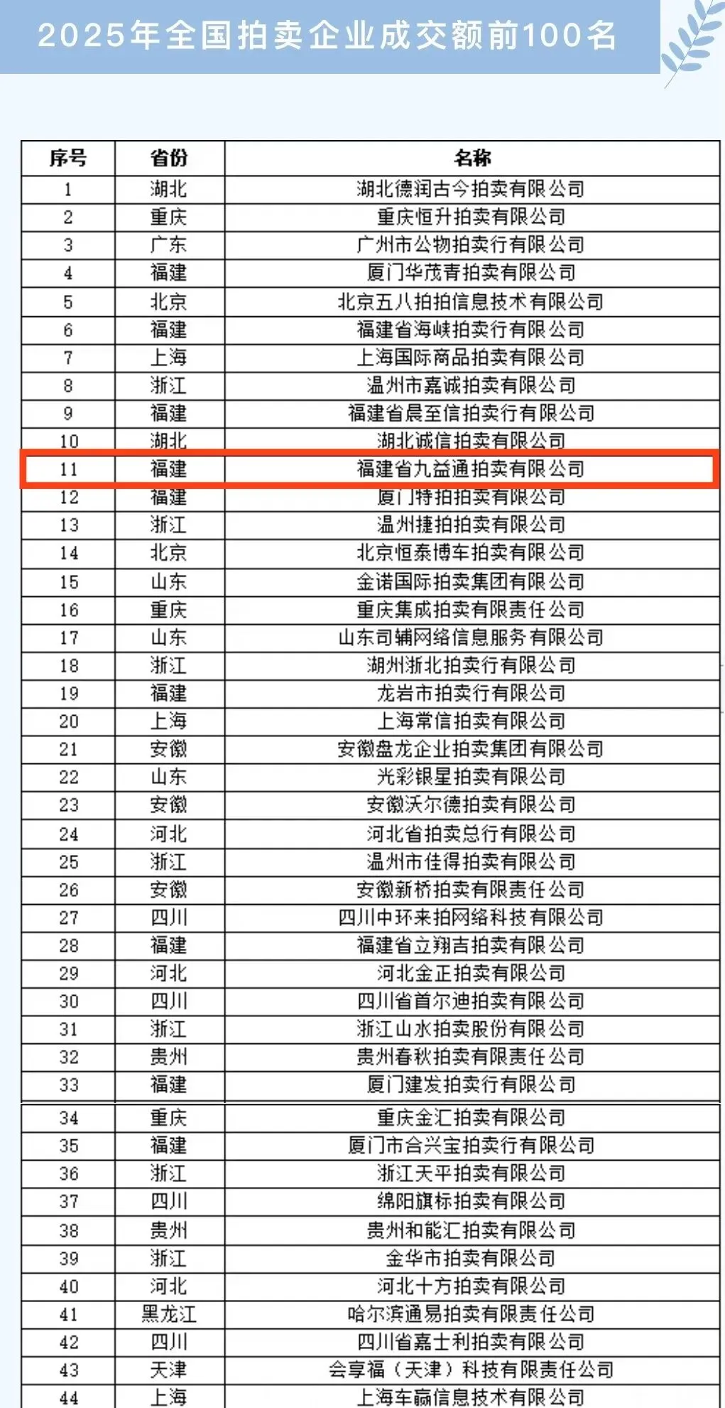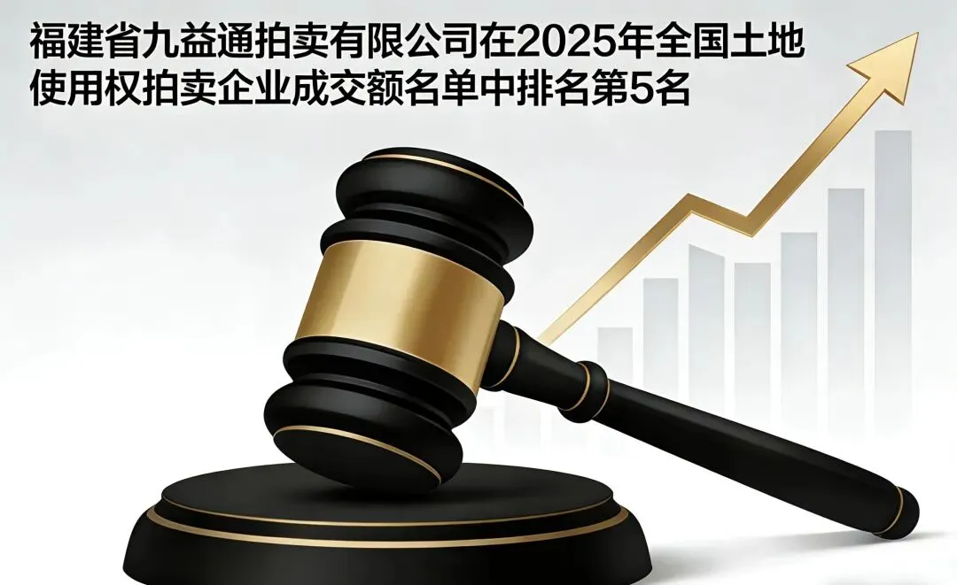 面对严峻复杂的经济形势与多重市场挑战,福建省九益通拍卖有限公司始终坚守初心、笃行实干,以精湛专业素养、坚定奋进信念与全员凝心聚力,在困境中稳根基、在挑战中谋发展,用实干担当筑牢发展根基,凭专业深耕交出亮眼答卷,斩获斐然业绩!在中国拍卖行业协会重磅发布《2025年中国拍卖企业总成交额前100名》榜单,福建九益通拍卖有限公司荣膺全国拍卖企业总成交额第11名!全国土地使用权拍卖企业成交额第5名!