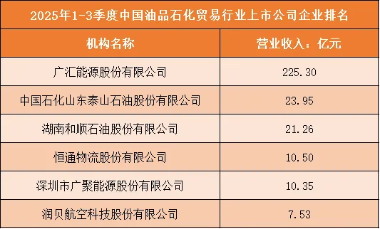 根据申万行业分类,2025年1-3季度中国油品石化贸易行业上市公司按营业收入排名如下:(A股上市公司)