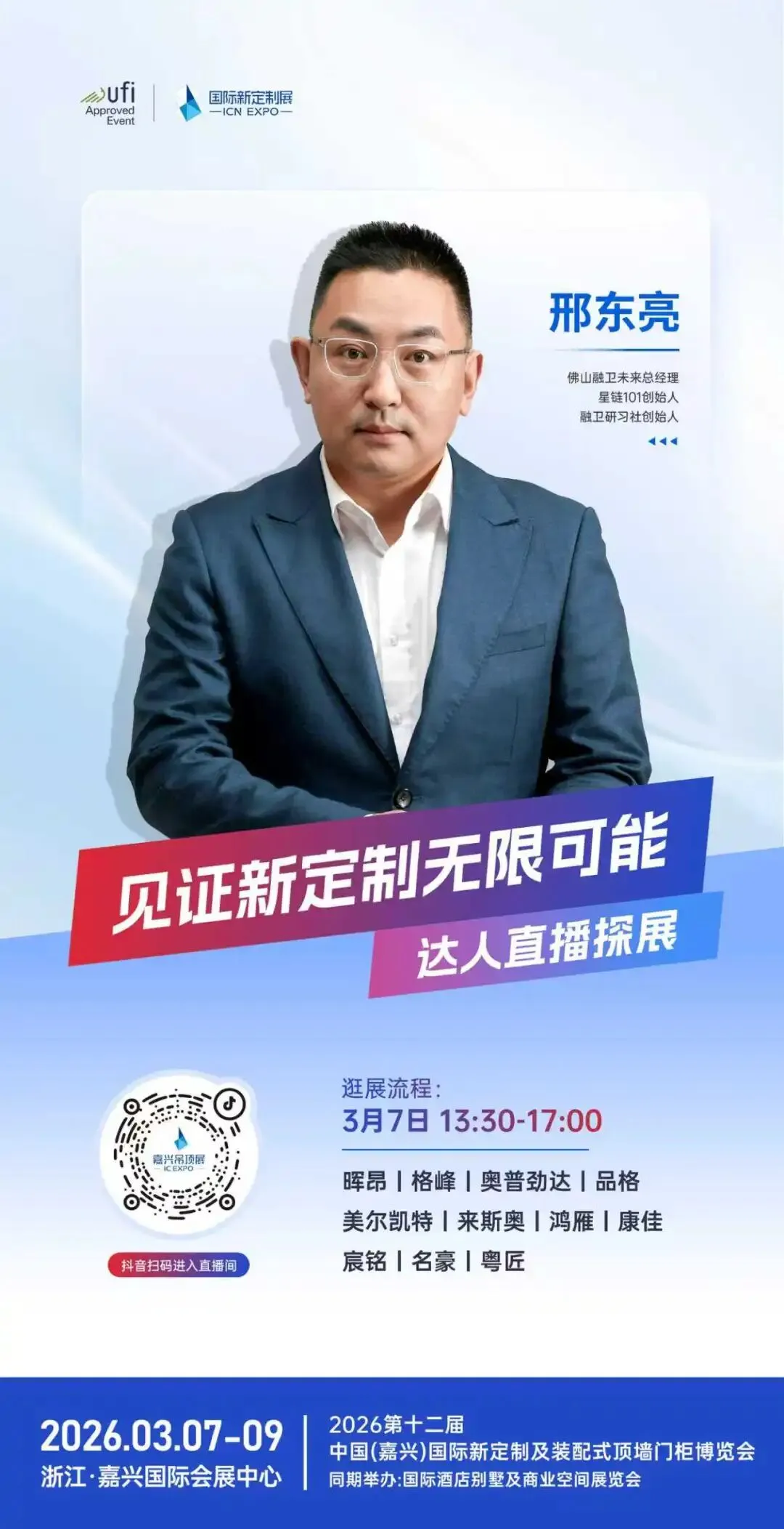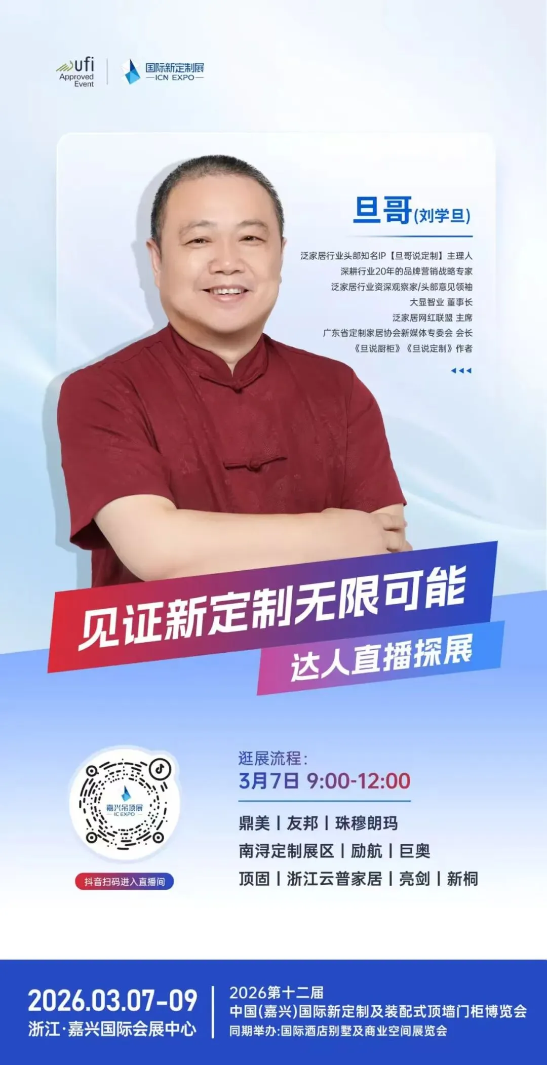 因故无法亲临展会现场的观众,2026国际新定制展组委会携手行业知名IP旦哥说定制、老邢建材经,为大家准备了直播逛展活动,云上品鉴本届展会!