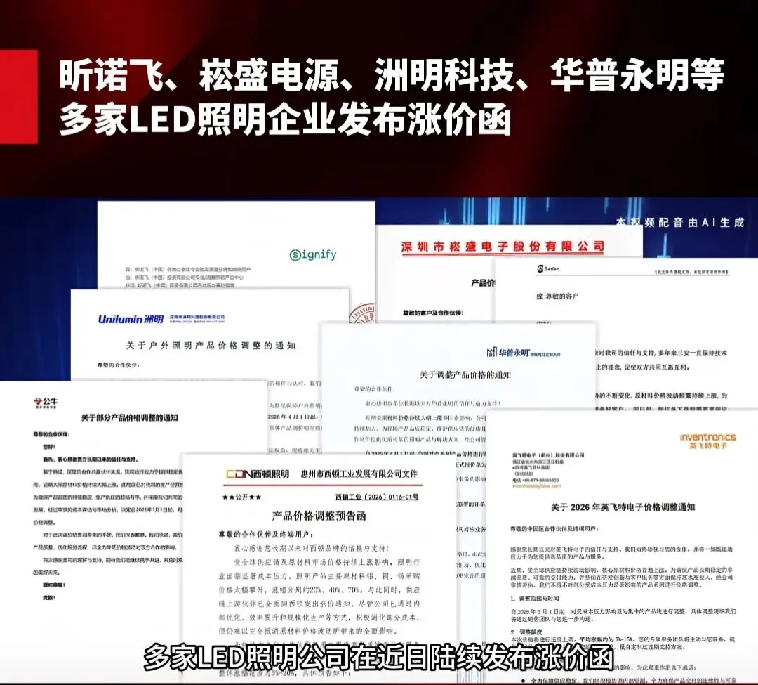 崧盛股份、华普永明、洲明科技等上市企业密集发布调价函,利亚德开年率先调价,国际巨头昕诺飞也多次大幅提价,涨价呈现全产业链传导态势。多年价格战让产品均价降 30%-40%,而此次成本冲击已远超企业消化能力w