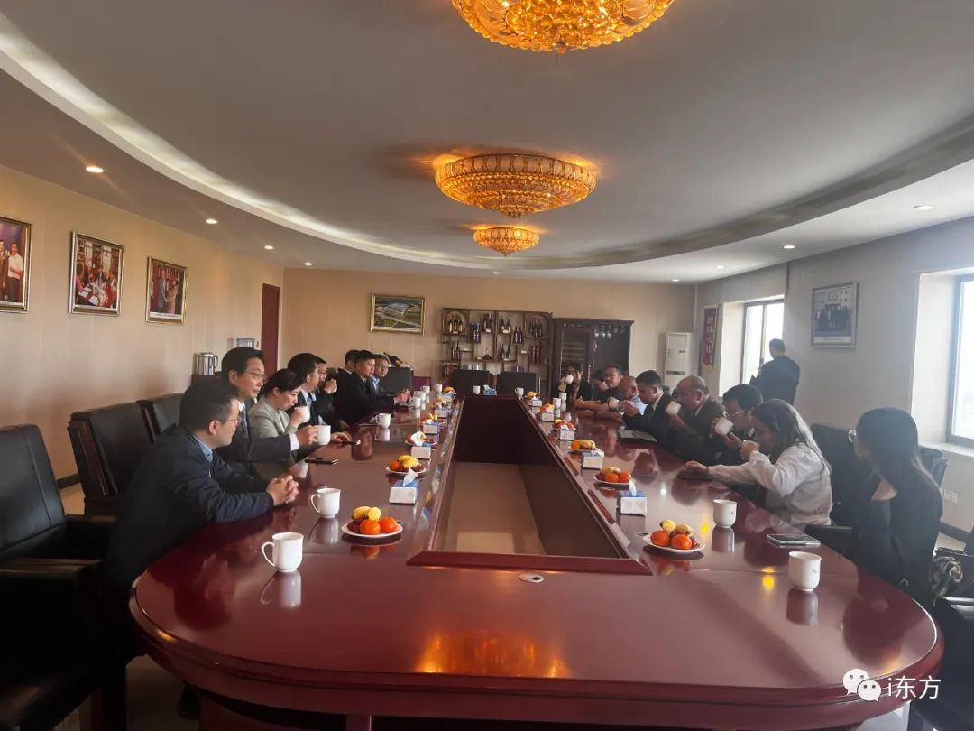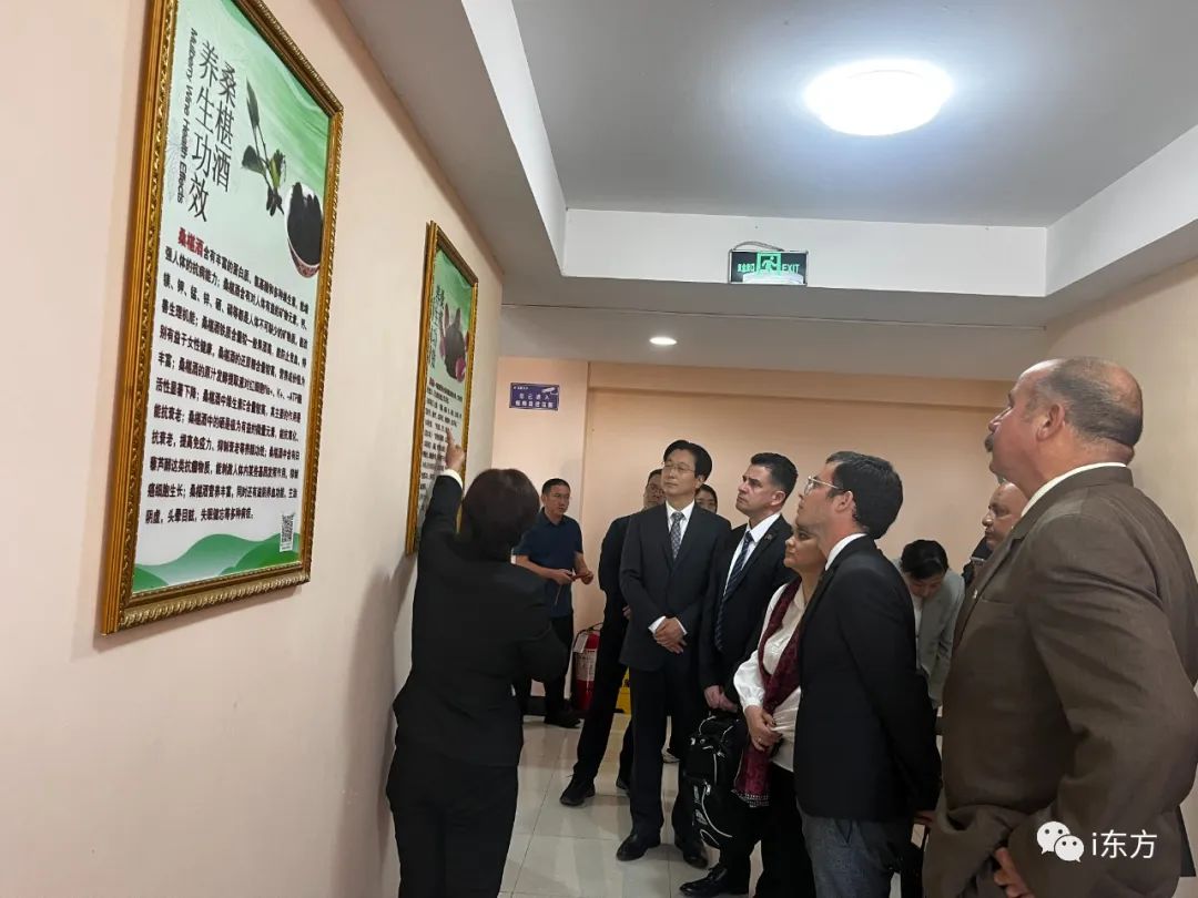 代表团首先来到东方紫酒业一楼大厅,对东方紫酒的历史、文化渊源、富农增收情况、紫酒品类开发等进行了详细了解。桑椹在中医文化中具有益肝补肾的功效,是药食同源产品,代表团对东方紫酒桑椹原汁酿造,保留桑椹原色、原味、原香的特色充满兴趣。