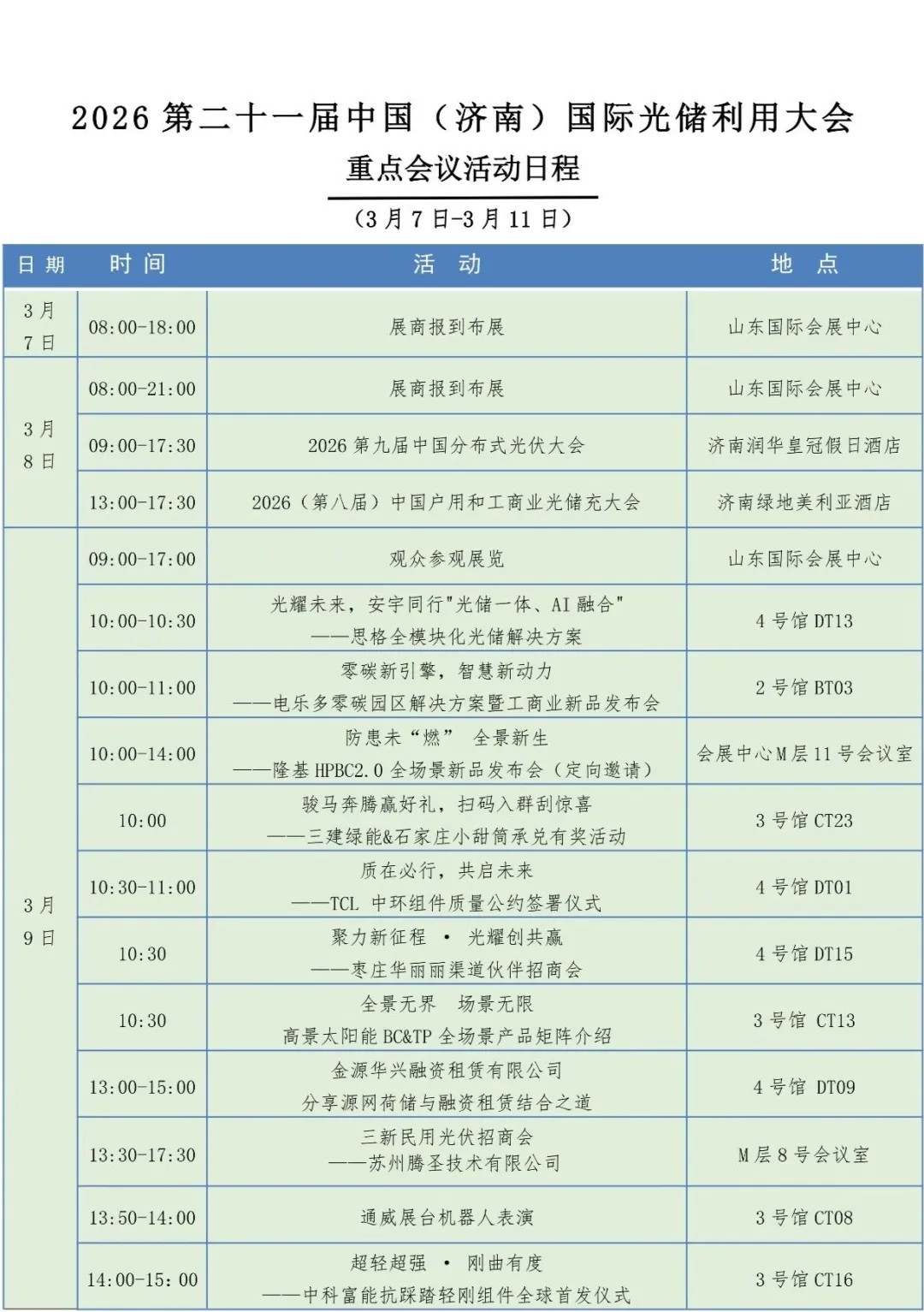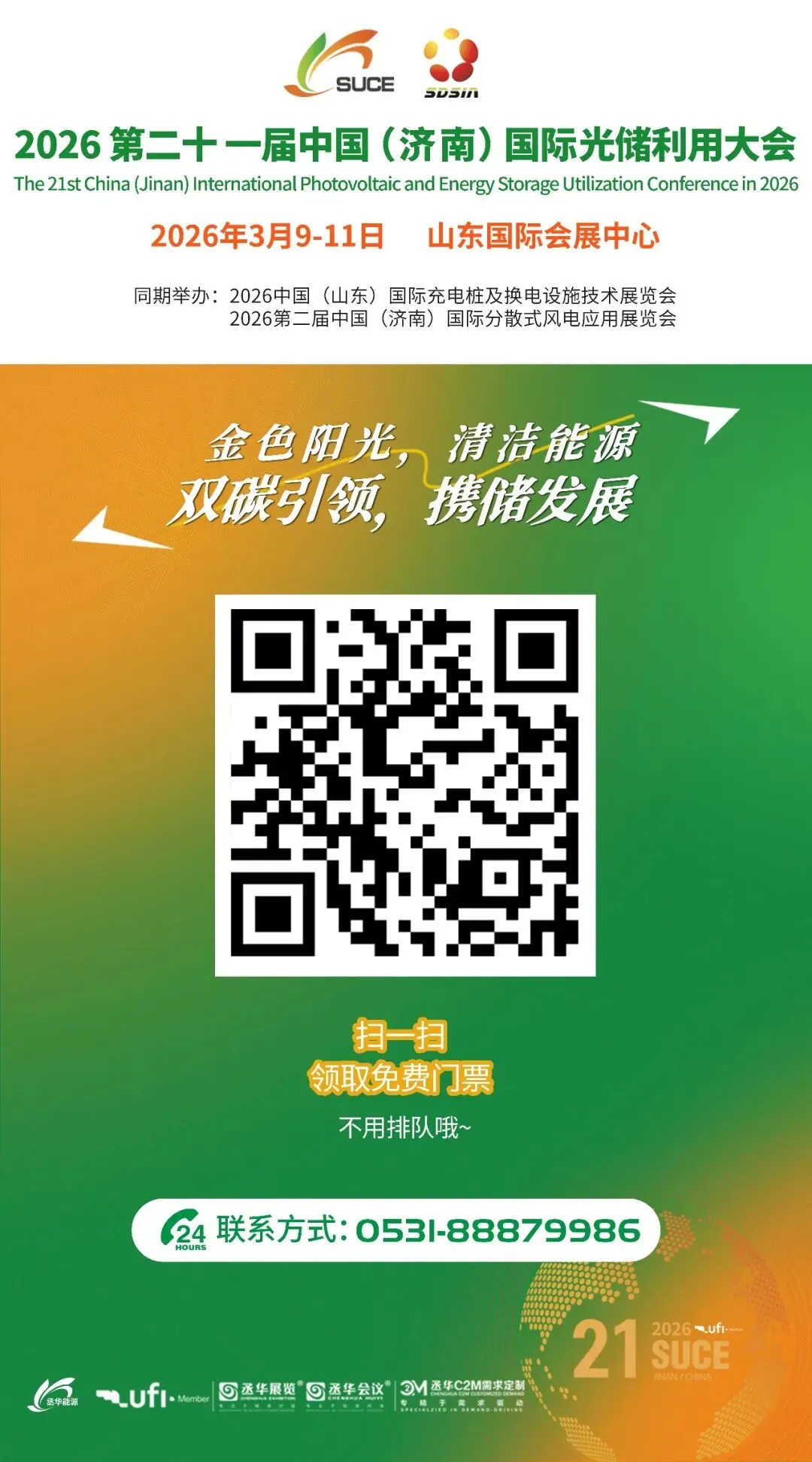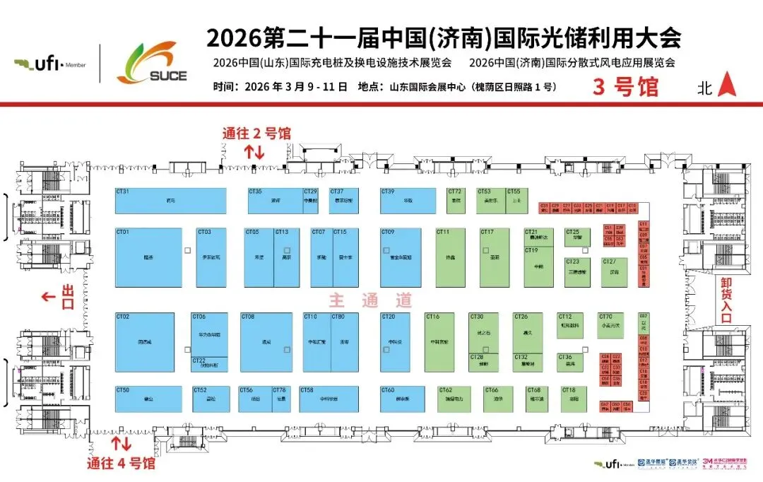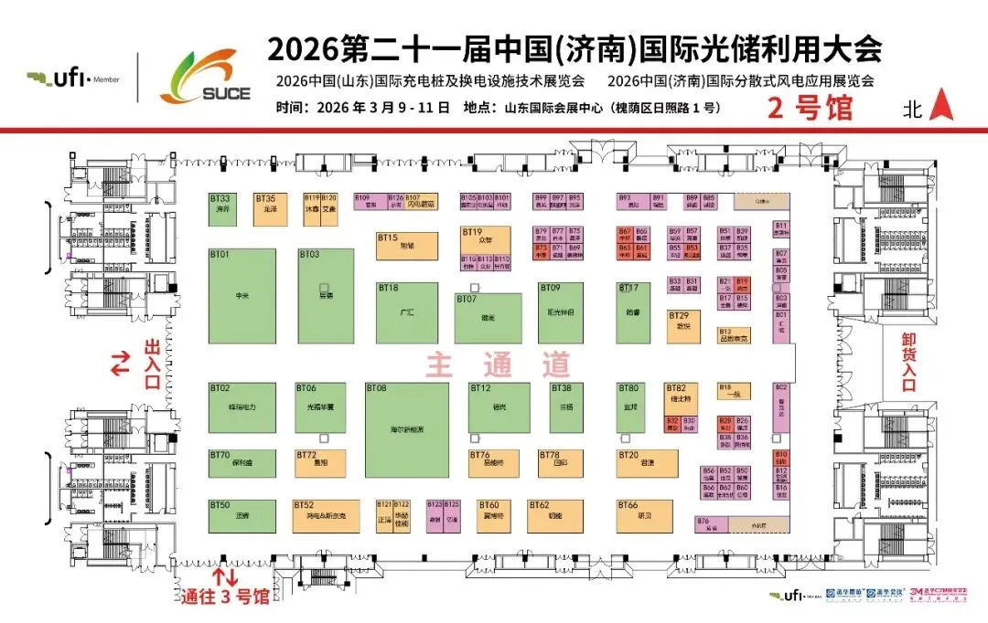 开年首展,抢占先机!2026第二十一届中国(济南)国际光储利用大会(SUCE 2026)将于2026年3月9-11日(周一至周三)在山东国际会展中心(槐荫区)盛大召开!应济南市公安机关落实大型群众性活动实名制入场的要求,做好本次展会期间实名制入场的工作;结合本次展会活动的实际情况;请您仔细阅读以下两种实名入场方式:请您提前准备好个人二代身份证,在序厅3、4号门入口处通过刷取二代身份证同时核对人脸后进入山东国际会展中心序厅。如您忘记携带个人二代身份证,请在序厅3、4号入口处通过扫描二维码并完成注册后,刷取个人入场二维码同时核对人脸后进入山东国际会展中心序厅。为了节约您的宝贵时间,您可提前扫描以下二维码进行注册,现场只需扫一下码,直接凭弹出的个人二维码快速入场。①所有入场人员通过刷取个人二代身份证或扫描注册入场二维码进入山东国际会展中心序厅③展商凭展商证件,观众通过扫描注册个人信息后至2/4号馆观众报到处换取参观证,凭证件通过每个展厅的入场闸机进入展厅本次展会展示规模50000平方米,主要设置了光伏、储能、充换电、光伏建筑一体化、分散式能源多能互补、产学研、金融等多个专业展区,涵盖了光伏、分布式电源、智慧能源、储能、充换电技术、风电等新能源领域的热点行业,众多知名厂商汇聚,集中展示最新产品、技术及应用和解决方案,充分代表了新能源行业的先进优势企业和中坚力量。全球500余家新能源品牌企业将盛装“出席”,不仅有世界500强和全球能源500强企业,还有中国民营500强企业,以及全球前50强光伏企业。#截止到3.5日,企业排名不分先后,按首字母排列