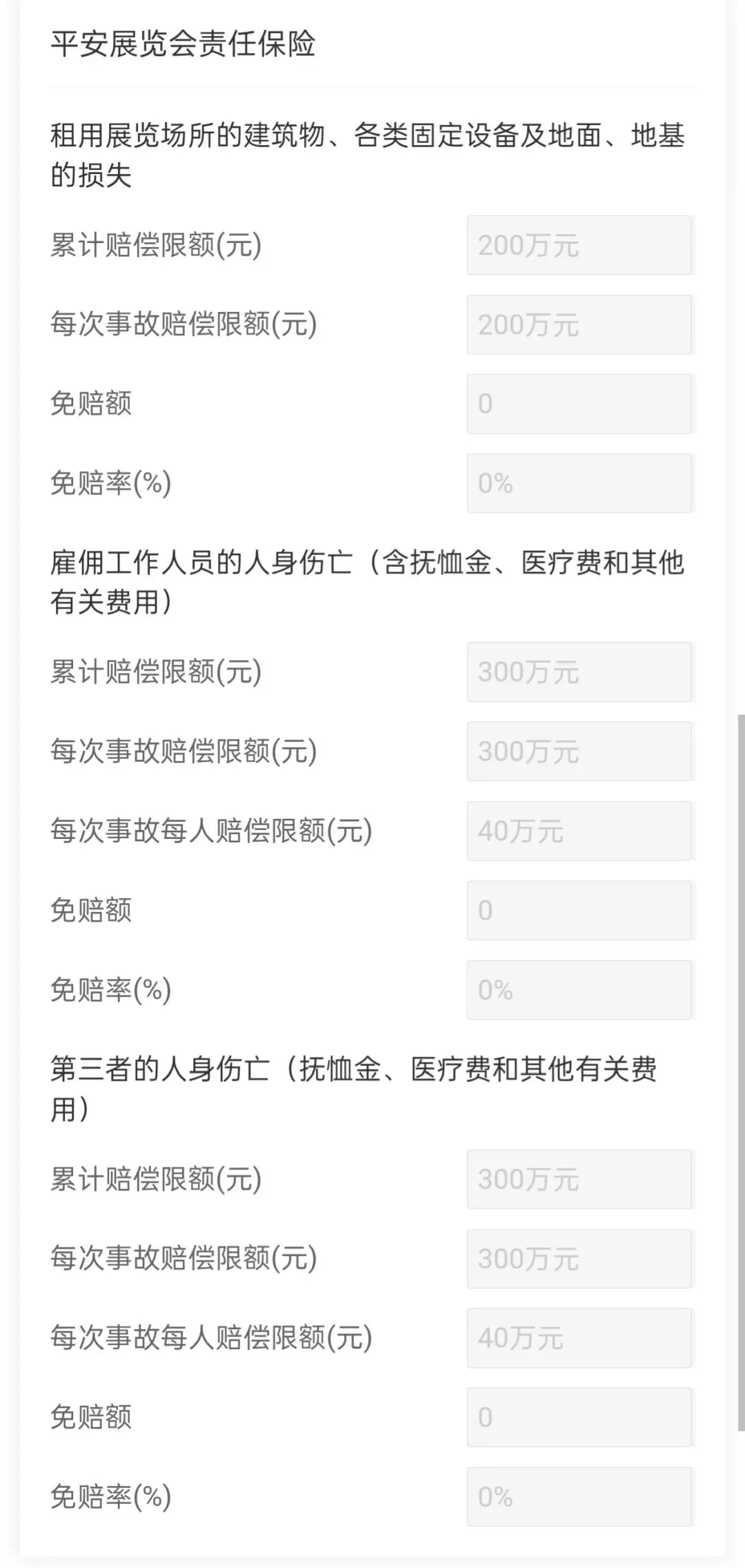 4、租用展览场所的建筑物、各类固定设备及地面、地基的损失:第三者损失:每次事故财产损失绝对免赔0元。