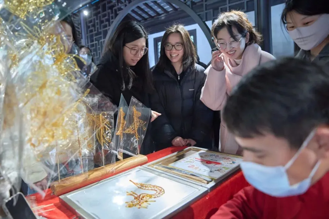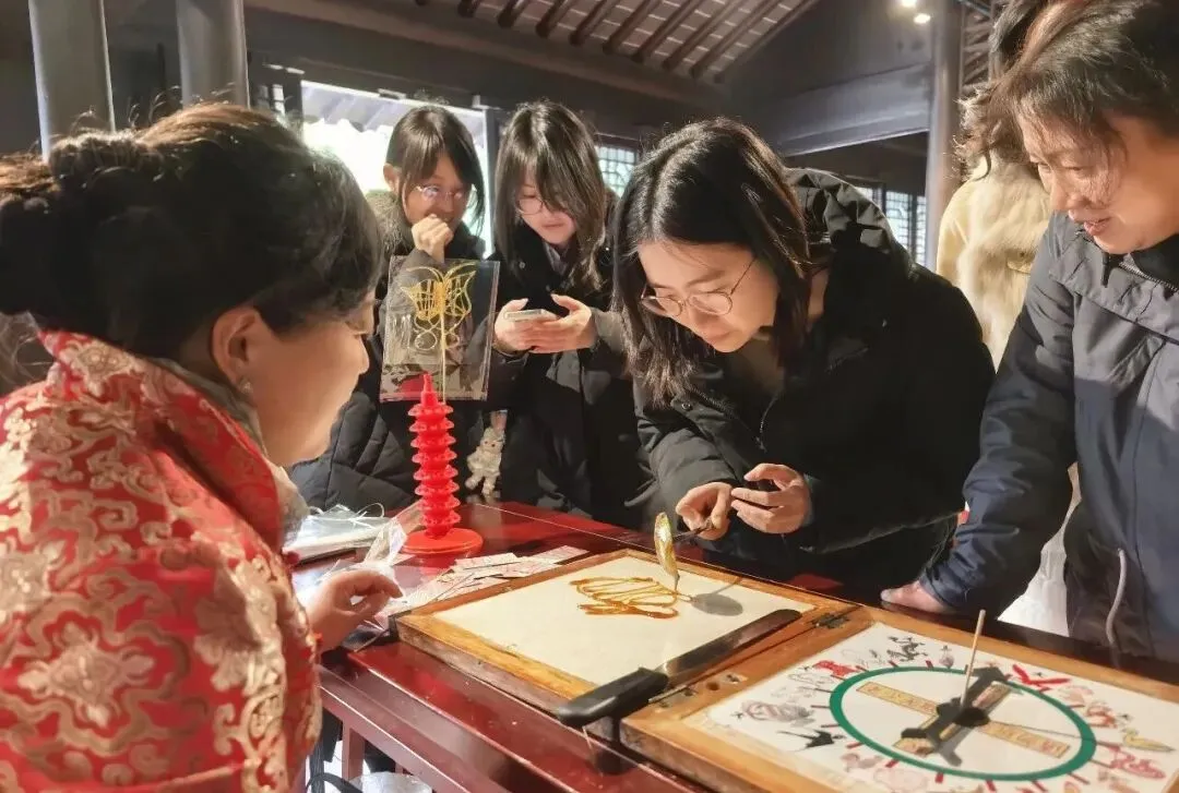 参观结束后,女职工们在百年老宅深处开启“双艺工坊”体验。茶室里,清雅的茶香漫过雕花门楣。大家一边品茗,一边欣赏着甘熙故居的旧影,在茶汤氤氲中品味老南京的闲适光阴。另一边的花格窗下,糖画传承人手腕轻转,以铜勺勾勒出晶莹剔透的生肖花卉。女职工们在老师手把手指导下画出属于自己的糖画,甜蜜的笑声在春日的院落里轻轻回荡。
