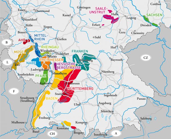 德国在葡萄酒世界中算得上是个“强国”,毕竟各种冰酒、BA、TBA常年占据着价格榜单的前排。而绝不是一个“大国”,因其种植面积不过10万余公顷,比波尔多产区小千余公顷呢。加上德国人消费力惊人,所以德国是个葡萄酒贸易“逆差国”,大量进口各国葡萄酒,而其本土葡萄酒出口量很少。这也造成了我们能接触到的德国酒往往也比较单调。其实,德国本土的葡萄酒种类和品种还是非常丰富的。