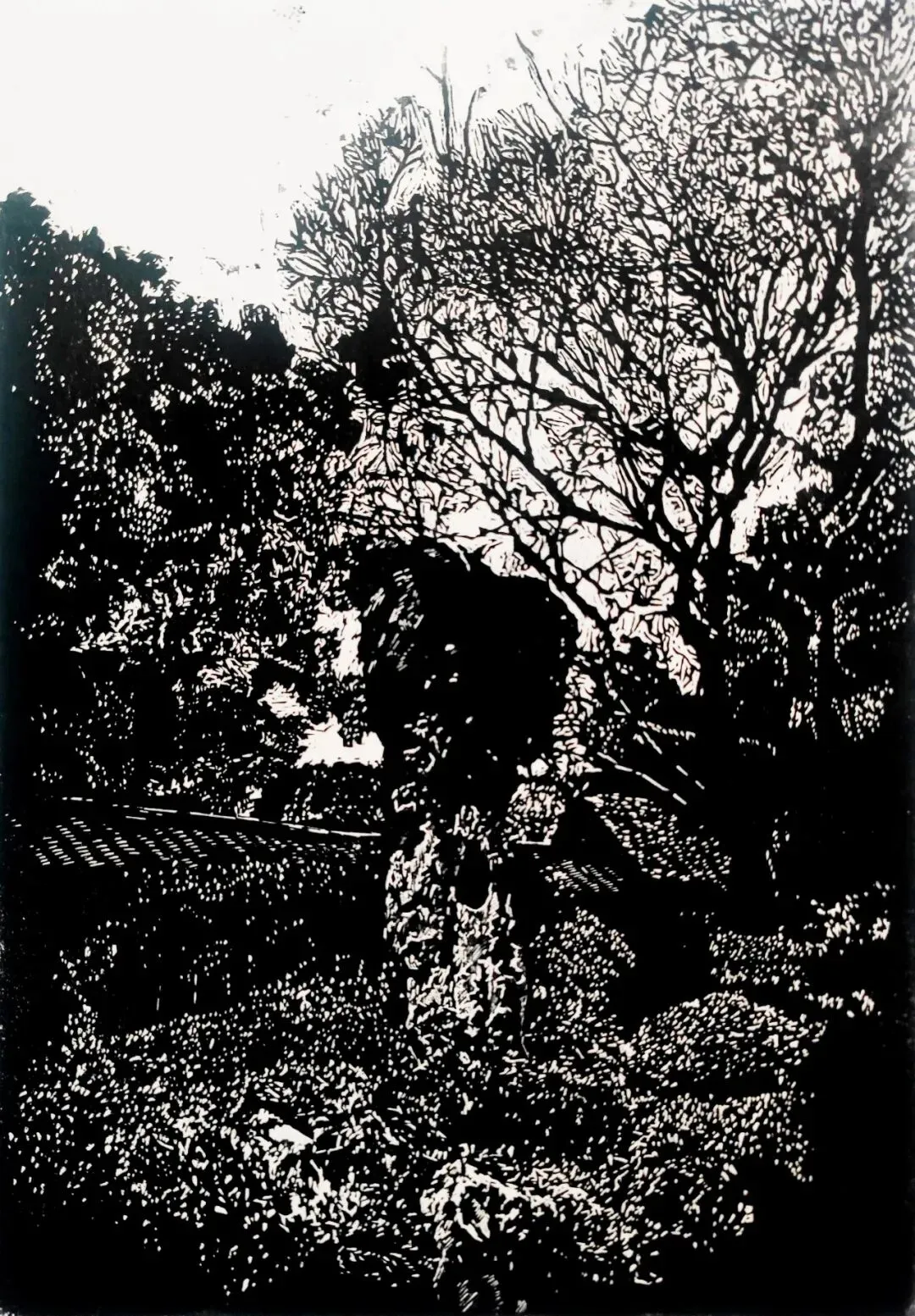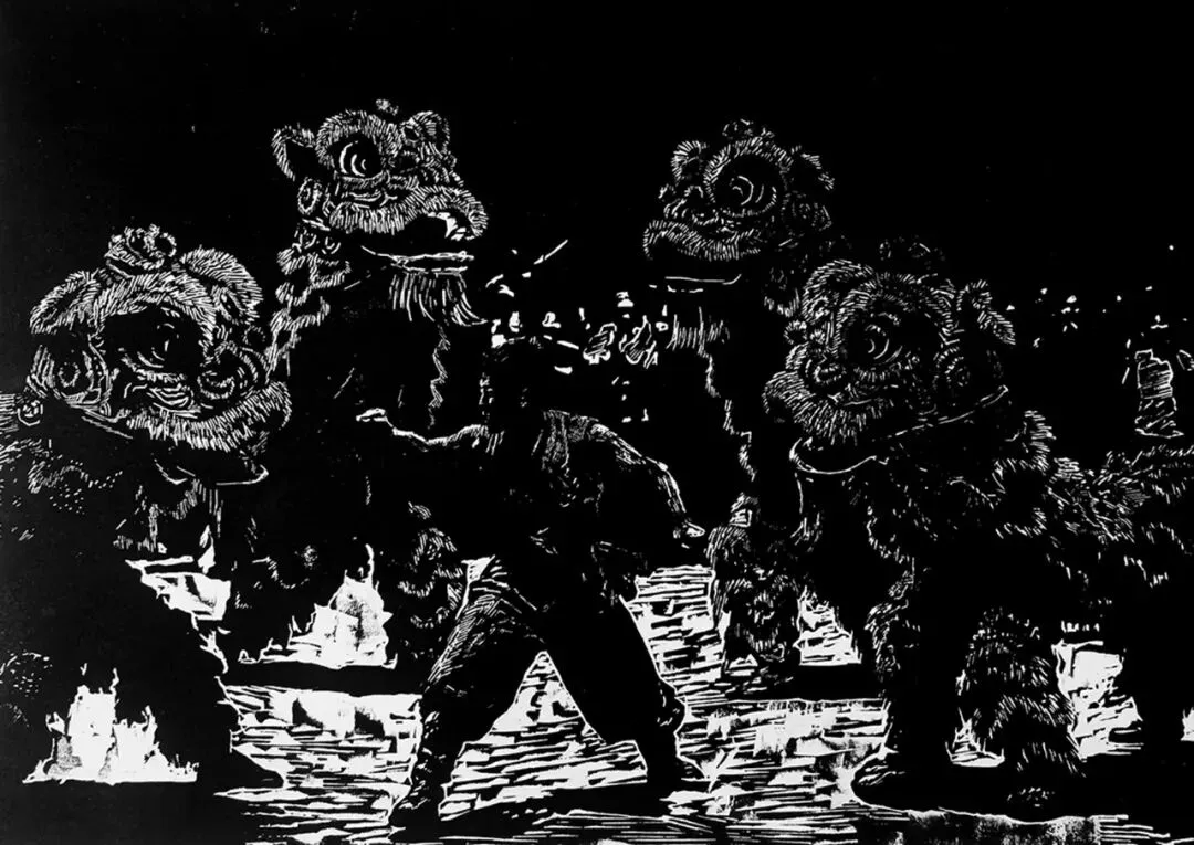 《狮影摇春》黑白木刻 40cmx28cm 2025年 刘健
