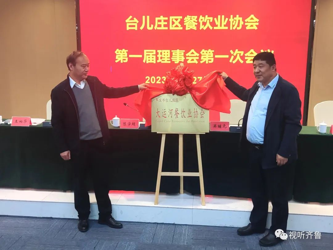 台儿庄区市场监管局党组书记、局长陈学超,台儿庄区商务和投资促进局党组书记、局长关继元为“台儿庄区餐饮业协会”揭牌。
