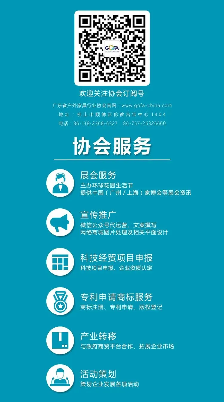 点击上方“广东省户外家具行业协会”订阅公众号,了解更多行业信息