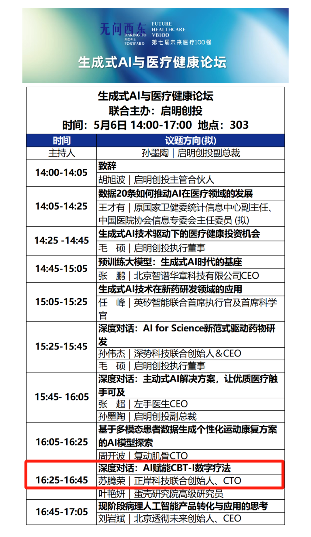 本届未来医疗100强大会设有3个主论坛,聚焦前沿科技成果与世界级医疗难题,领军企业战略、创投新风向;30+个分论坛,关注医疗健康行业细分领域,探讨当前热门议题。正岸健康联合创始人、CTO苏腾荣,将在大会上分享《AI赋能CBT-I数字疗法》,深度解析领先的AI技术如何赋能精神心理健康数字化解决方案和服务。