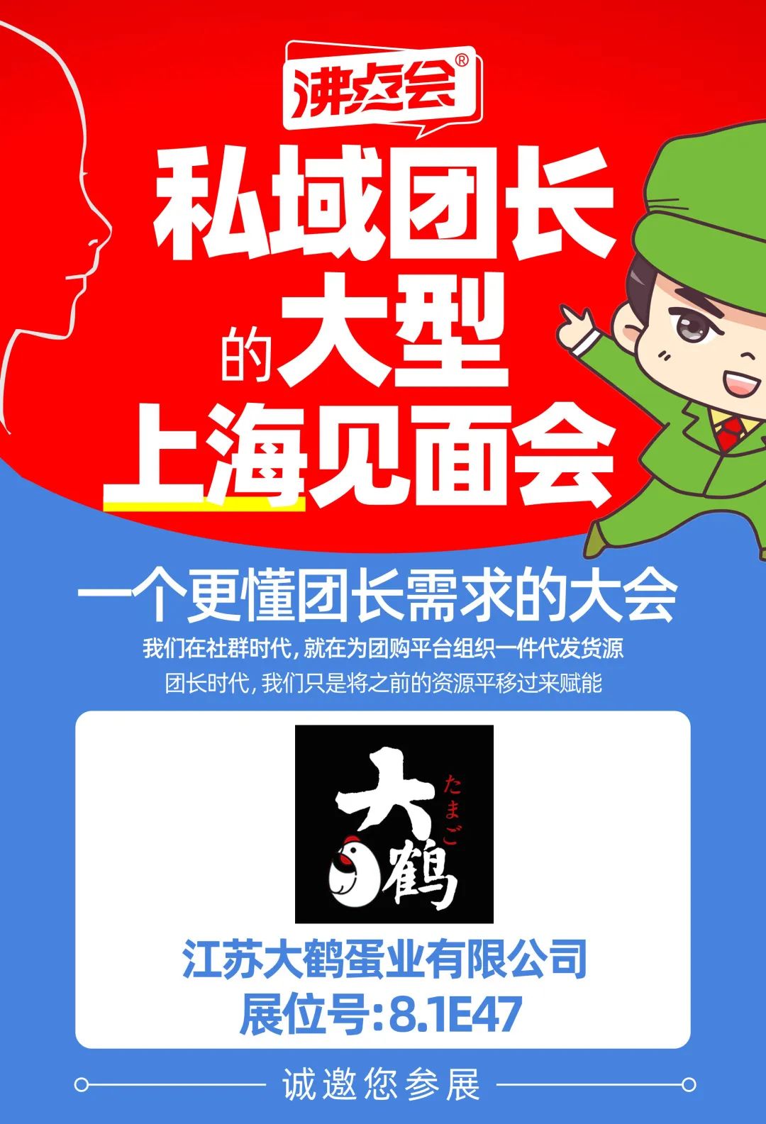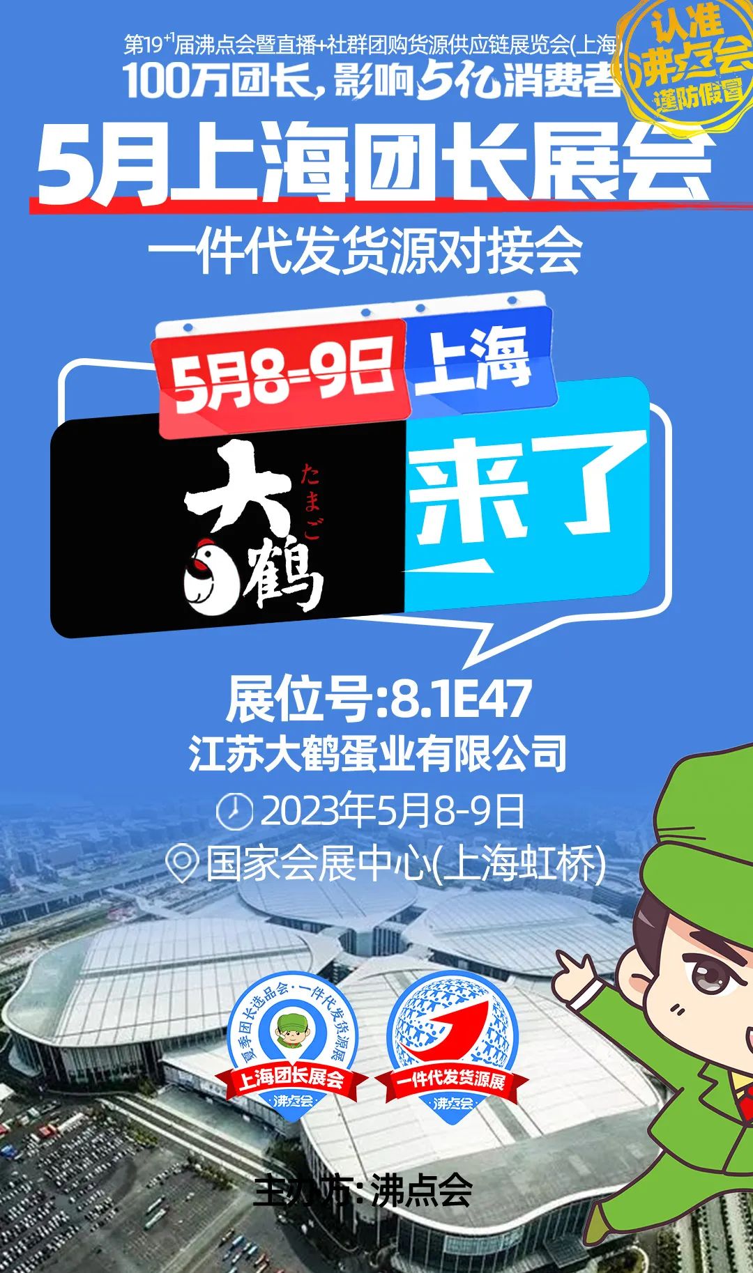 5月8-9日,上海团长大会将在国家会展中心(上海虹桥)。展会2200个展位,50000平展览面积,1200+供货商,超20000+新品爆品。届时,江苏大鹤蛋业有限公司将亮相本次展会。