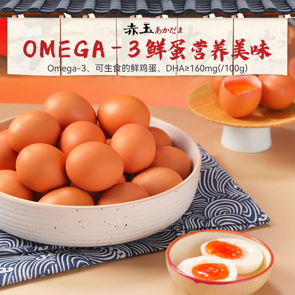 赤玉可生食Omega-3鸡蛋,规格:30枚/1800克;10枚/600克,Omega-3含量:≥300mg/100g;DHA含量:≥160mg/100g,出厂哈夫值:≥85。赤玉Omega-3是可生食鸡蛋的升级版,通过进口优质亚麻籽粉和天然海藻喂养,经过母鸡体内自然消化吸收,最终富集到鸡蛋黄中,赤玉鸡蛋黄中含有丰富的ɑ-亚麻酸和卵磷脂型DHA,是一款营养更全面的功能性鸡蛋。作为Omege-3家族中的主要成员DHA,属于卵磷脂型DHA,在人体内吸收方式为主动吸收,吸收率超过90%。