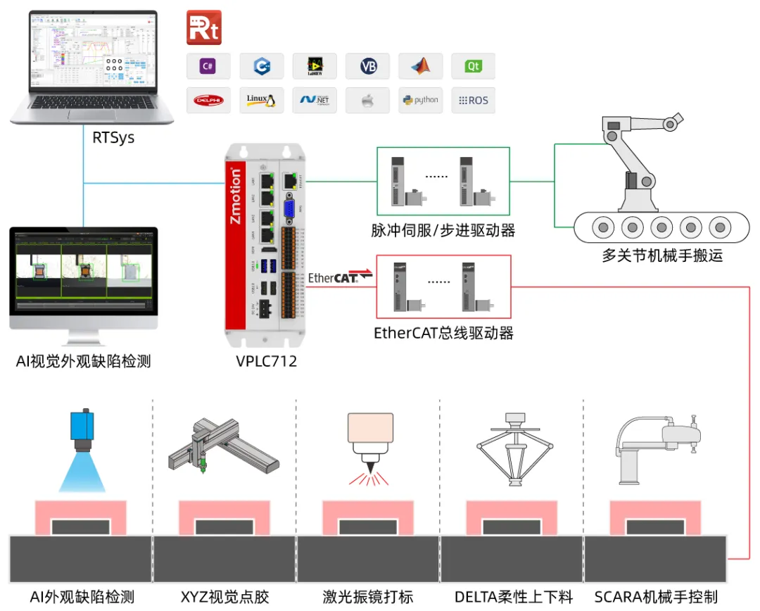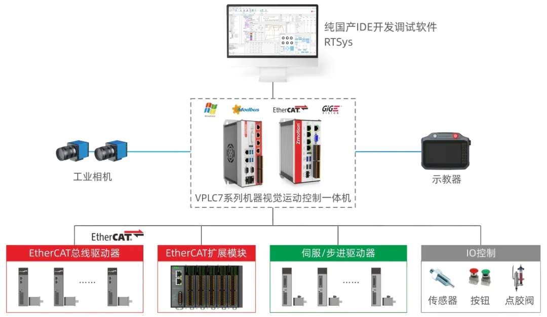 提供一体化开放式IPC形态的实时软控制器/软PLC集成的视觉+运动控制解决方案。面向多场景“视觉+运动控制”应用,可灵活配置与升级。相较传统封闭式“视觉+运控”硬件堆叠方案,可显著降低定制与迭代成本,缩短联调周期,强化数据交互实时性,降低项目落地与运维复杂度。