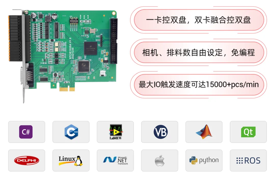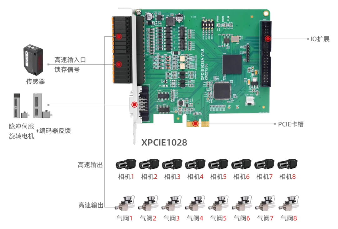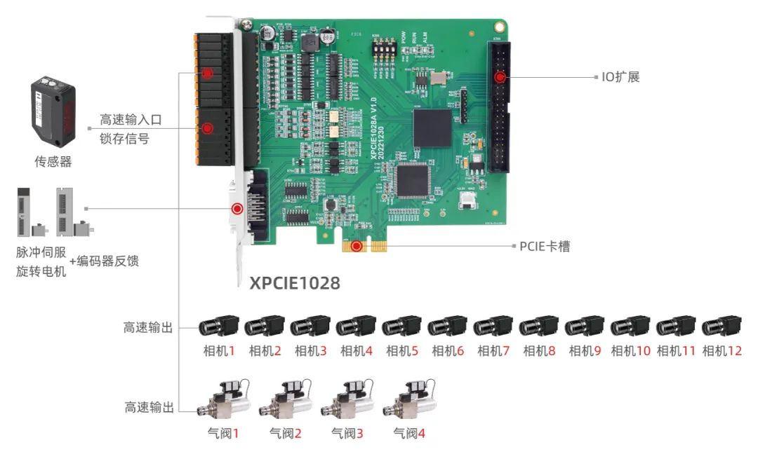 XPCIE1028具备16路高速输出口,可1-16路视觉飞拍与高速吹气排料自由设定。