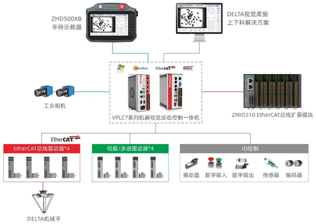 方案基于VPLC系列视觉运动控制一体机和RTFuse视觉系统所拓展的DELTA柔振上下料专用系统,实现即插即用一站式解决方案,满足市场对灵活供料的需求,可克服传统供料方式的局限,实现了快速物料切换和配置工艺,提升兼容性。