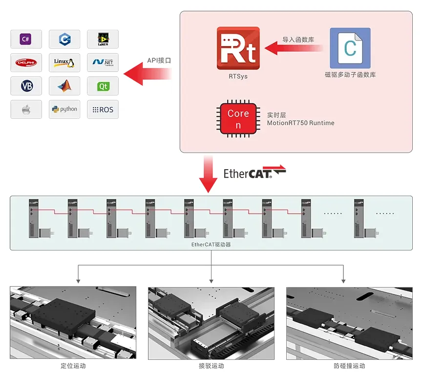 每个动子独立控制,支持单独或成组编队实现同步/异步移动,并在分岔/合并点自由地切换轨道。