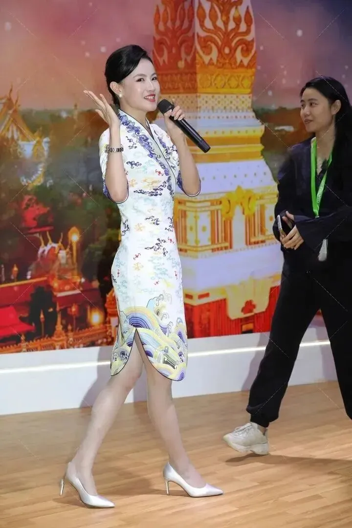 她手里拿.着麦克风,正和旁.边的人聊得热络.。改良之后的短款.旗袍,.行动特别方.便。裙摆的.高开叉设计.,不仅.显得腿.型好看,还让她整.个人看起来轻盈利.落。这种打.扮太聪.明了——.既保留了旗袍的.优雅,又不.会让人觉得拘.束。在展会这种.需要不停走动的场.合,穿得自在.才是王道。