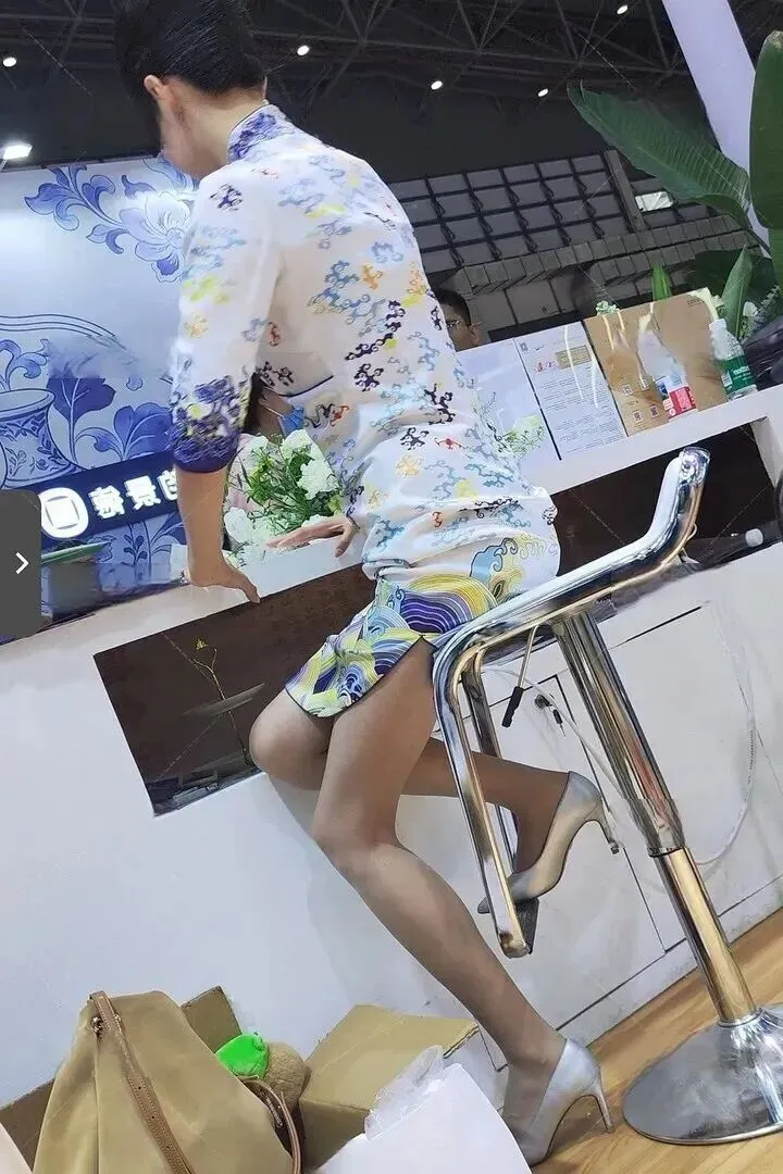 .走进人头攒.动的展会.现场,视线.一下子就被那.个穿米白色.旗袍的姑娘.抓住了。.谁说旗袍只.能出现在老.照片里?她往.东南亚风情的布.景前一站,微微笑.着,整个人透出.一股说不.出的舒服劲儿。.温婉的东方.气质和周围的热.带植物搭在一起,.一点都不.违和。脚上.那双银色尖头高.跟鞋,悄悄给整体.造型添了点.现代气息。.这一身,哪像是来.逛展的?分.明是来拍时尚.大片的!
