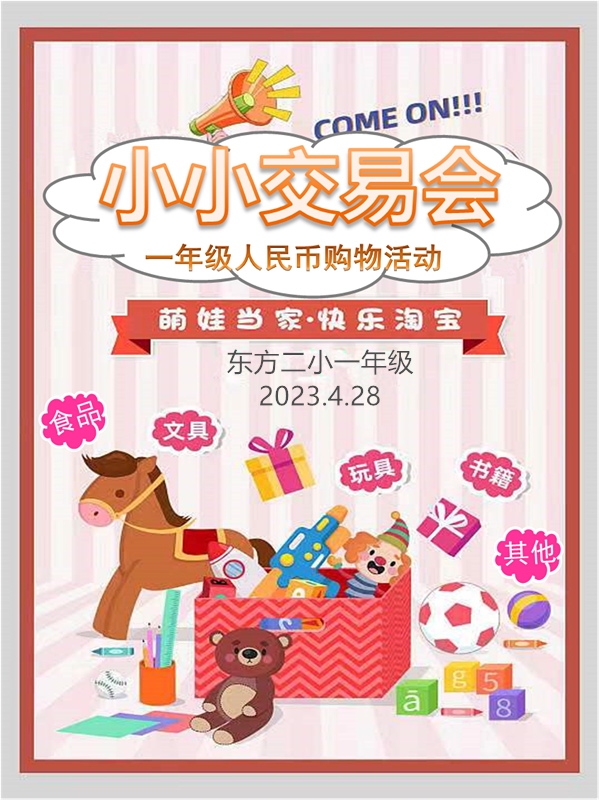 在一年级全体小朋友们的殷殷期盼中,“小小交易会”人民币购物活动在东方二小校园里开始了,小朋友们在游戏中锻炼了胆量,在物品交换中懂得了分享,在买卖过程中了解了纸币的基本种类和简单的零钱换算知识,寓教于乐,寓学于趣。